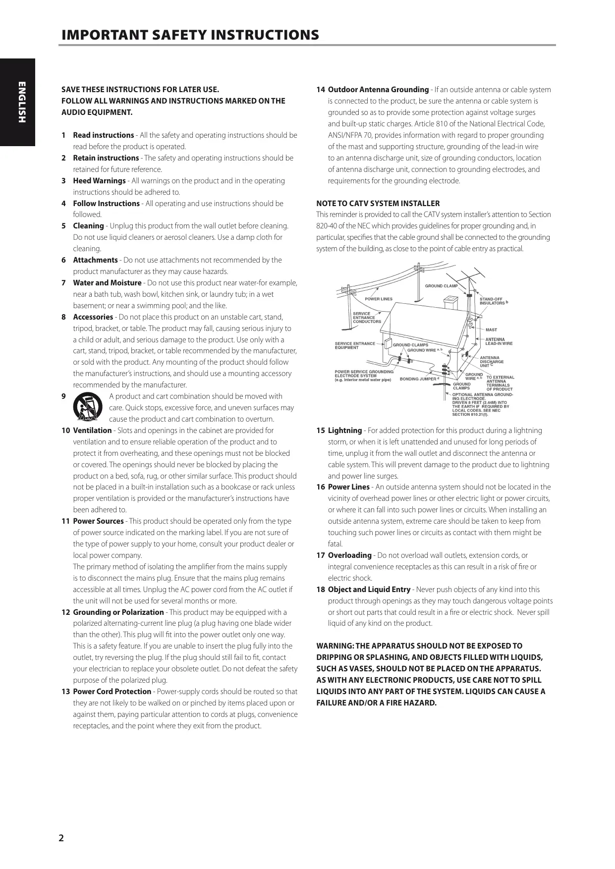 IMPORTANT SAFETY INSTRUCTIONS SAVE THESE INSTRUCTIONS FOR LATER USE. FOLLOW ALL WARNINGS AND INSTRUCTIONS MARKED ON THE AUDIO EQUIPMENT.