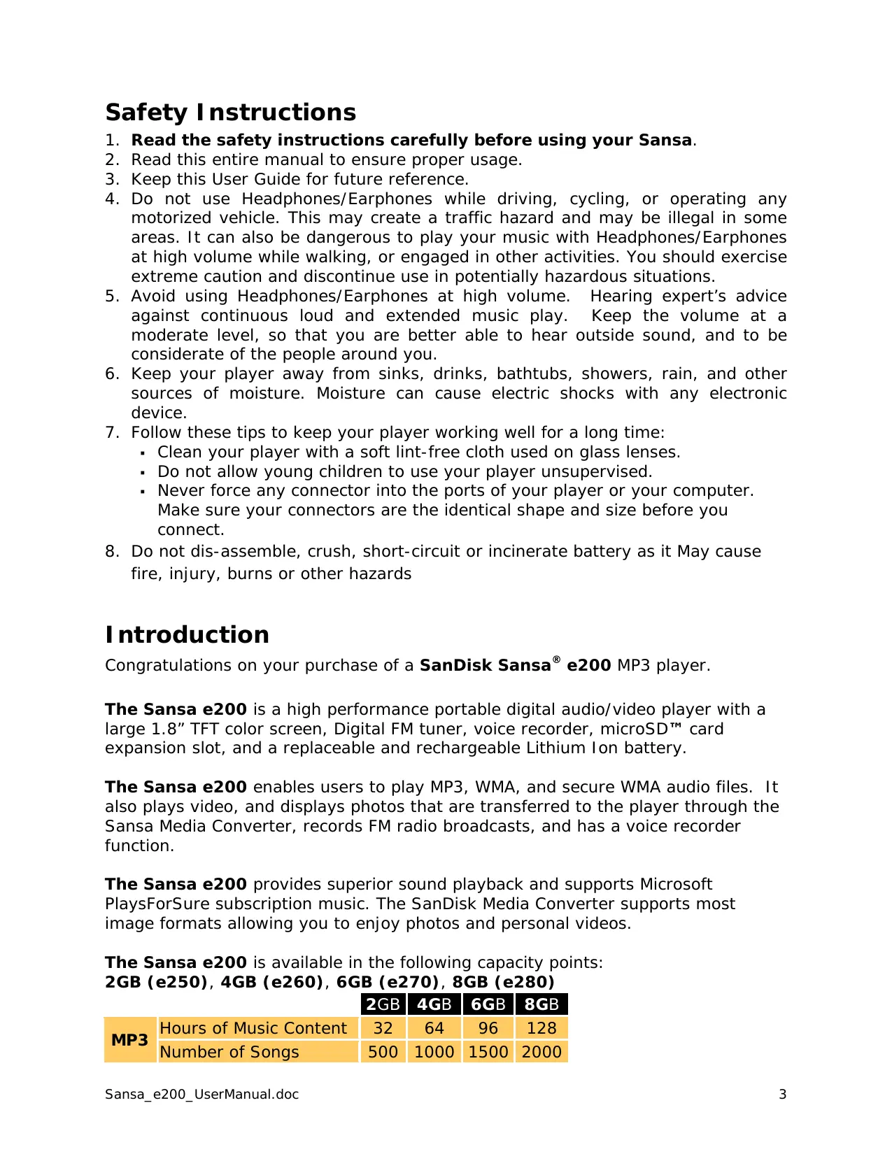 fire, injury, burns or other hazards Introduction Congratulations on your purchase of a SanDisk Sansa® e200 MP3 player. The Sansa e200 is a high performance portable digital audio/video player with a large 1.8” TFT color screen, Digital FM tuner, voice recorder, microSD" card expansion slot, and a replaceable and rechargeable Lithium lon battery. The Sansa e200 enables users to play MP3, WMA, and secure WMA audio files. It also plays video, and displays photos that are transferred to the player through the Sansa Media Converter, records FM radio broadcasts, and has a voice recorder function. The Sansa e200 provides superior sound playback and supports Microsoft PlaysForSure subscription music. The SanDisk Media Converter supports most image formats allowing you to enjoy photos and personal videos. The Sansa e200 is available in the following capacity points: 2GB (e250), 4GB (e260), 6GB (e270), 8GB (e280) Sansa_e200_UserManual.doc 3