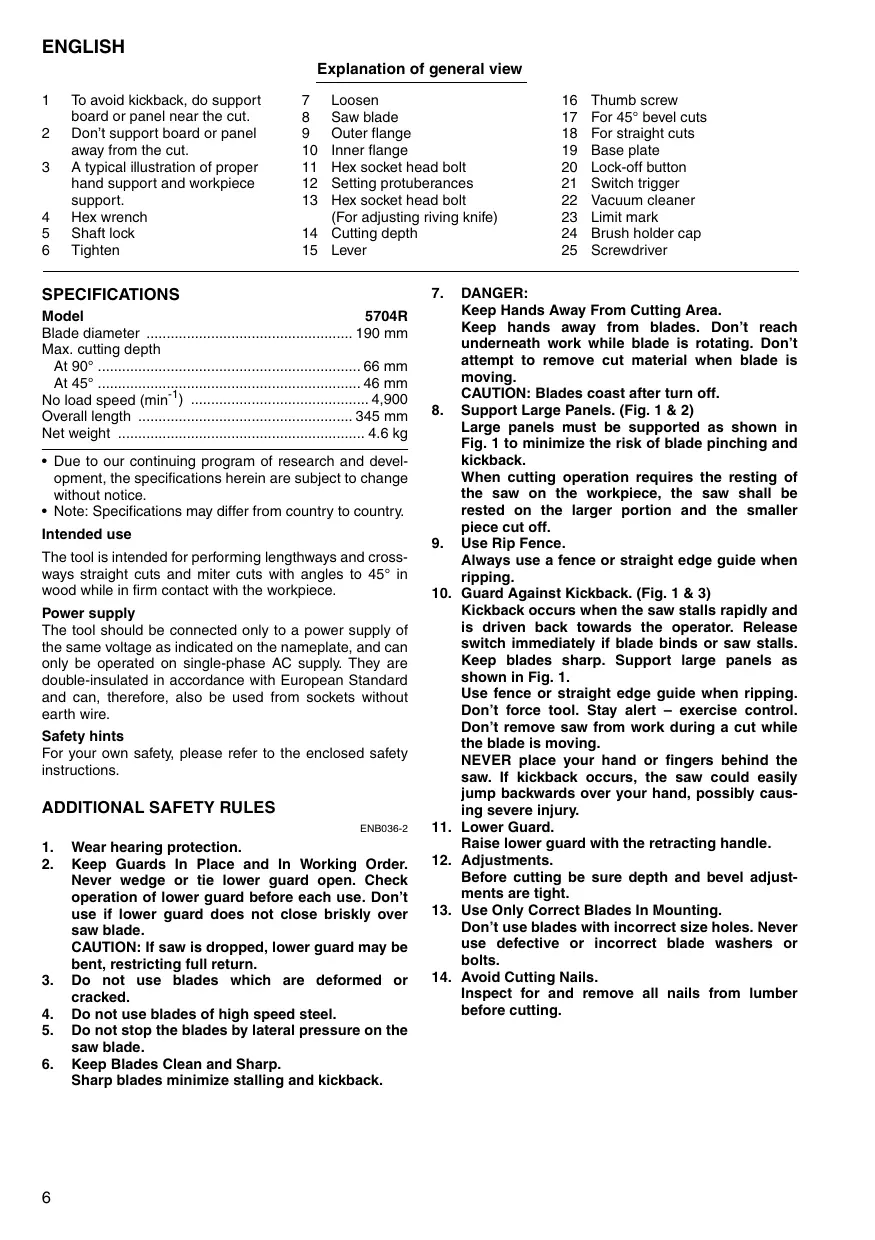 Power supply The tool should be connected only to a power supply of the same voltage as indicated on the nameplate, and can only be operated on single-phase AC supply. They are double-insulated in accordance with European Standard and can, therefore, also be used from sockets without earth wire. Safety hints For your own safety, please refer to the enclosed safety instructions. Wear hearing protection. Keep Guards In Place and In Working Order. Never wedge or tie lower guard open. Check operation of lower guard before each use. Don’t use if lower guard does not close briskly over saw blade. CAUTION: If saw is dropped, lower guard may be bent, restricting full return. Do not use blades which are deformed or cracked. Do not use blades of high speed steel. Do not stop the blades by lateral pressure on the saw blade. Keep Blades Clean and Sharp. Sharp blades minimize stalling and kickback.