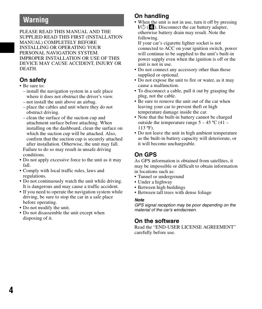 - Between tall trees with dense foliage Note GPS signal reception may be poor depending on the material of the car’s windscreen. On the software Read the “END-USER LICENSE AGREEMENT” carefully before use.