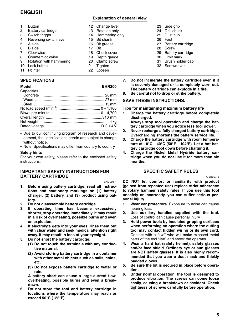 | 2 | Battery cartridge | 13 | Rotation only | 24 Drill chuck |