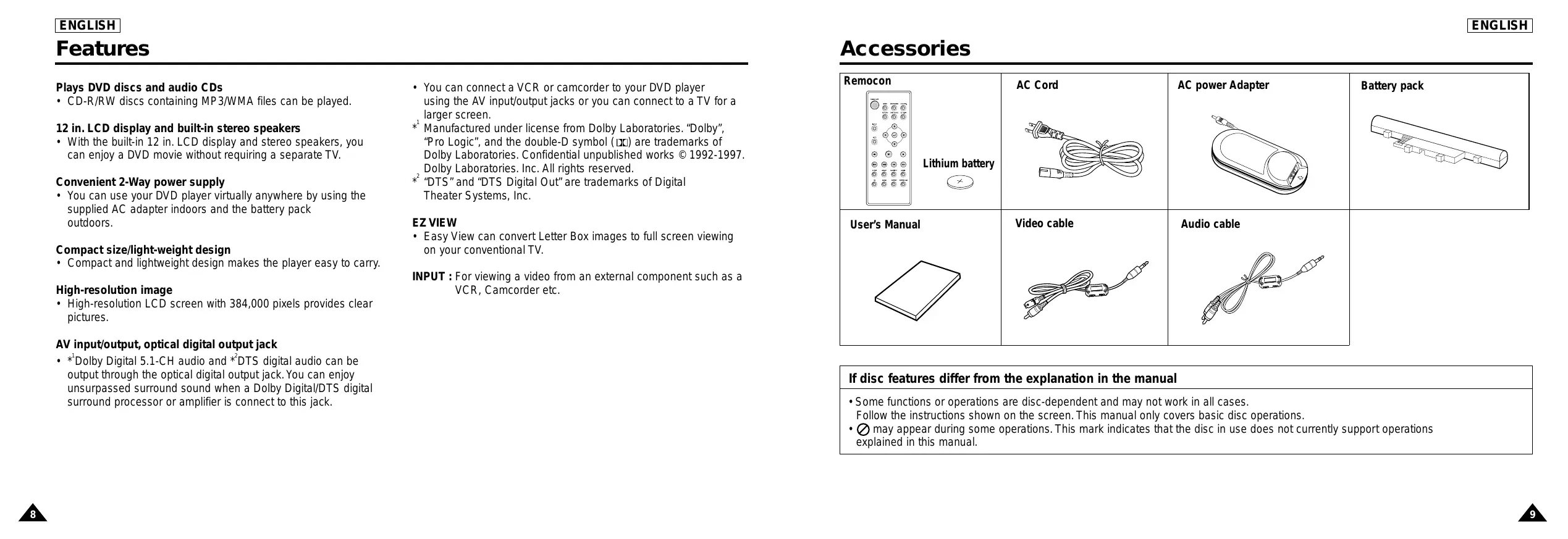 Features Plays DVD discs and audio CDs + CD-R/RW discs containing MP 3/WMA files can be played. L LCD display and built-in stereo speakers + With the built-in 12 in. LCD display and stereo speakers, you can enjoy a DVD movie without requiring a separate TV. Convenient 2-Way power supply + You can use your DVD player virtually anywhere by using the supplied AC adapter indoors and the battery pack outdoors. Compact size/light-weight design + Compact and lightweight design makes the player easy to carry. High-resolution image + High-resolution LCD screen with 384,000 pixels provides clear pictures. AV input/output, optical digital output jack + *Dolby Digital 5.1-CH audio and *DTS digital audio can be output through the optical digital output jack. You can enjoy unsurpassed surround sound when a Dolby Digital/DTS digital surround processor or amplifier is connect to this jack. + You can connect a VCR or camcorder to your DVD player using the AV inputoutput jacks or you can connect to a TV for a larger screen.