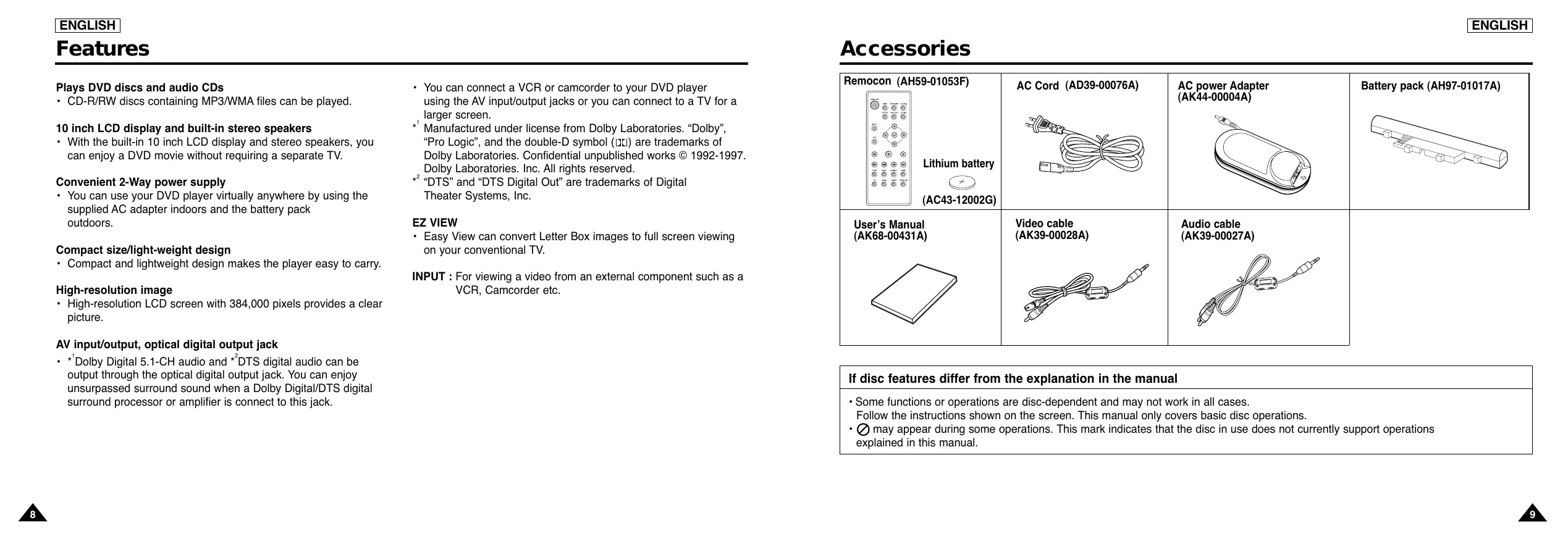 Features Plays DVD discs and audio CDs + CD-R/RW discs containing MP3/WMA files can be played. 10 inch LCD display and built-in stereo speakers + With the built-in 10 inch LCD display and stereo speakers, you can enjoy a DVD movie without requiring a separate TV. Convenient 2-Way power supply + You can use your DVD player virtually anywhere by using the supplied AC adapter indoors and the battery pack outdoors. Compact size/light-weight design + Compact and lightweight design makes the player easy to carry. High-resolution image + High-resolution LCD screen with 384,000 pixels provides a clear picture. AV input/output, optical digital output jack . *’Dolby Digital 5.1-CH audio and “DTS digital audio can be output through the optical digital output jack. You can enjoy unsurpassed surround sound when a Dolby Digital/DTS digital surround processor or amplifier is connect to this jack. + You can connect a VCR or camcorder to your DVD player using the AV input/output jacks or you can connect to a TV for a larger screen.