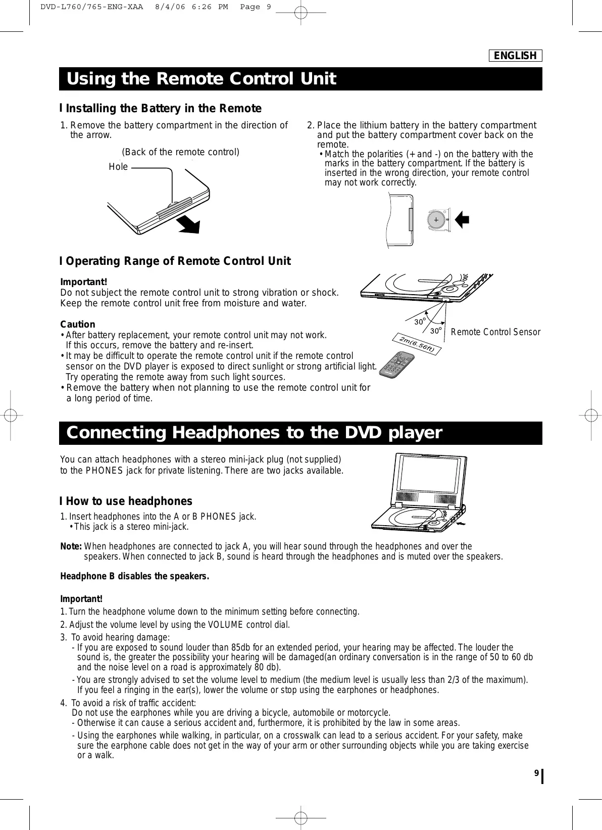 - Remove the battery when not planning to use the remote control unit for a long period of time. Connecting Headphones to the DVD player You can attach headphones with a stereo mini-jack plug (not supplied) to the PHONES jack for private listening. There are two jacks available. l'How to use headphones