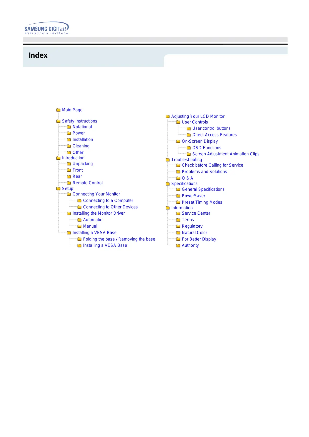 SAMSUNG DIGITalL everyone's Invitedm Index Main Page Safety Instructions Notational Power Installation Cleaning Other Introduction Unpacking Front Rear Remote Control etup Connecting Your Monitor Connecting to a Computer Connecting to Other Devices Installing the Monitor Driver Automatic Manual Installing à VESA Base Folding the base / Removing the base Installing à VESA Base Adjusting Your LCD Monitor User Controls User control buttons Direct-Access Features On-Screen Display OSD Functions Screen Adjustment Animation Clips Troubleshooting Check before Calling for Service Problems and Solutions Q&A Specifications eneral Specifications Powers aver Preset Timing Modes Information Service Center Regulatory Natural Color or Better Display Authority
