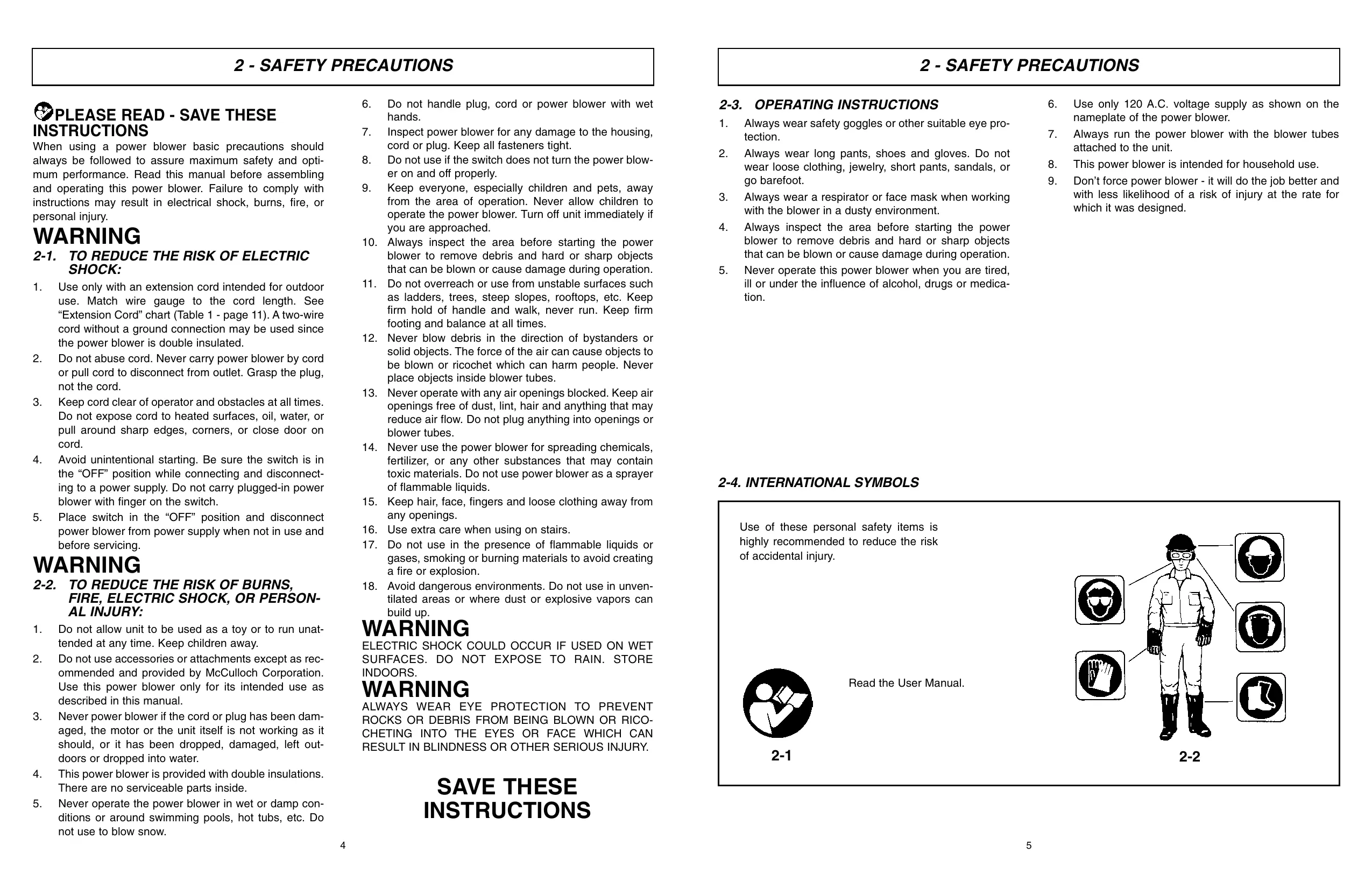 Use of these personal safety items is highly recommended to reduce the risk of accidental injury. Read the User Manual. WARNING 2-1 2-2 SAVE THESE INSTRUCTIONS