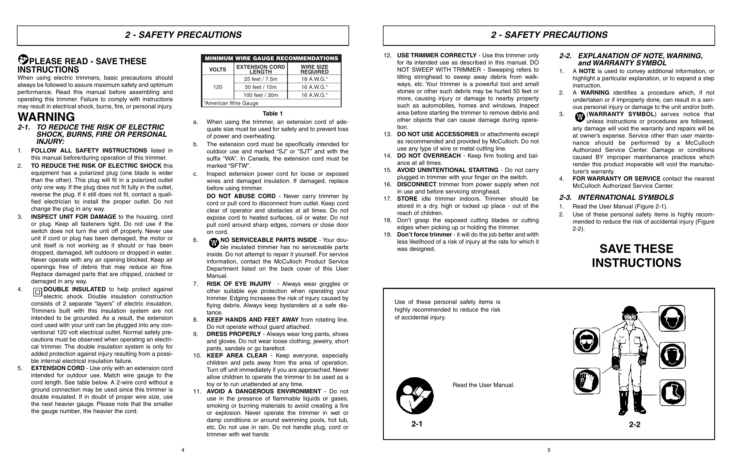 - EXTENSION CORD - Use only with an extension cord intended for outdoor use. Match wire gauge to the cord length. See table below. A 2-wire cord without a ground connection may be used since this trimmer is double insulated. If in doubt of proper wire size, use the next heavier gauge. Please note that the smaller the gauge number, the heavier the cord.