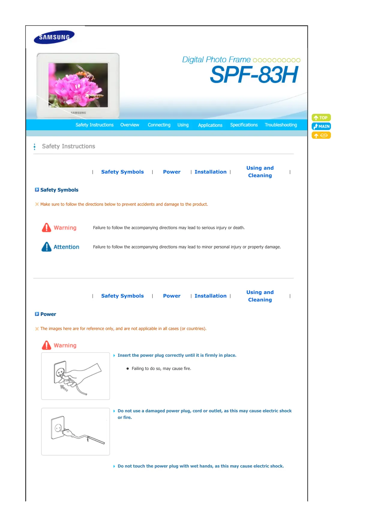 SPF-83H Safety Instructions Overview Connecting Using Applications Specifications Troubleshooting