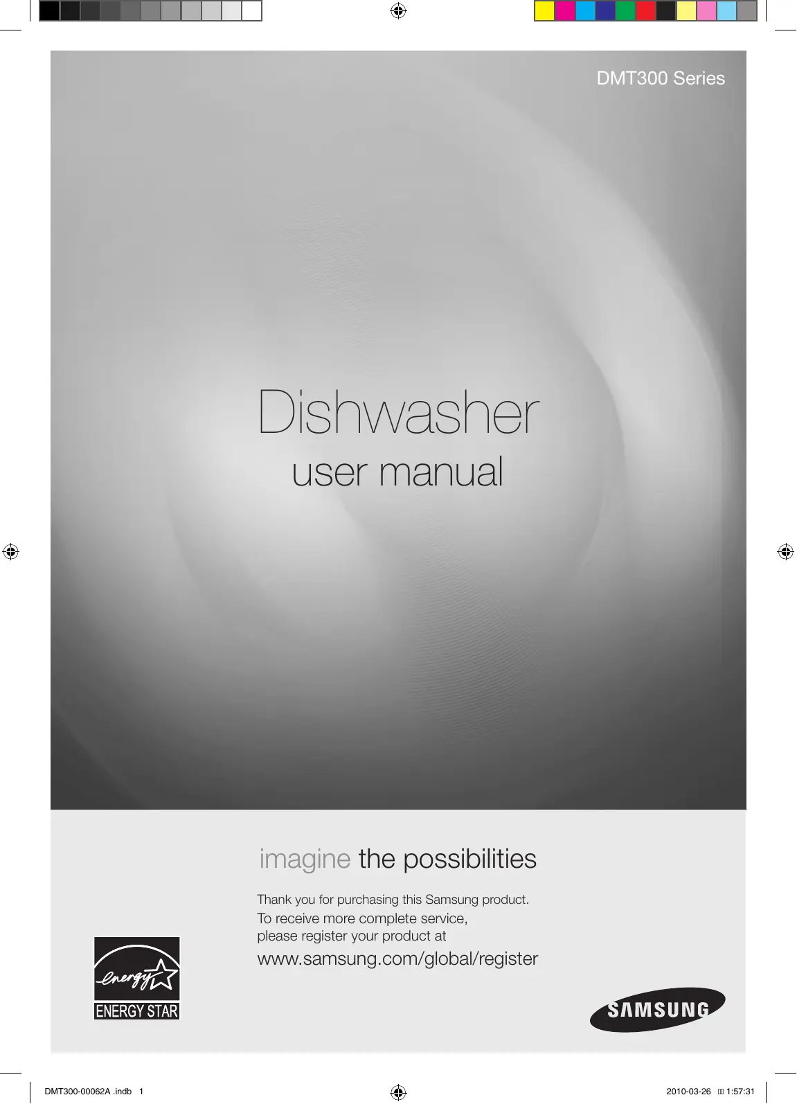 Dishuasher user manual imagine the possibilities Thank you for purchasing this Samsung product. To receive more complete service, please register your product at Www.samsung.com/global/register ENERGY STAR Psrusuncg | Duracc-co0s2a ina 1 & 20100826 mrsrat |