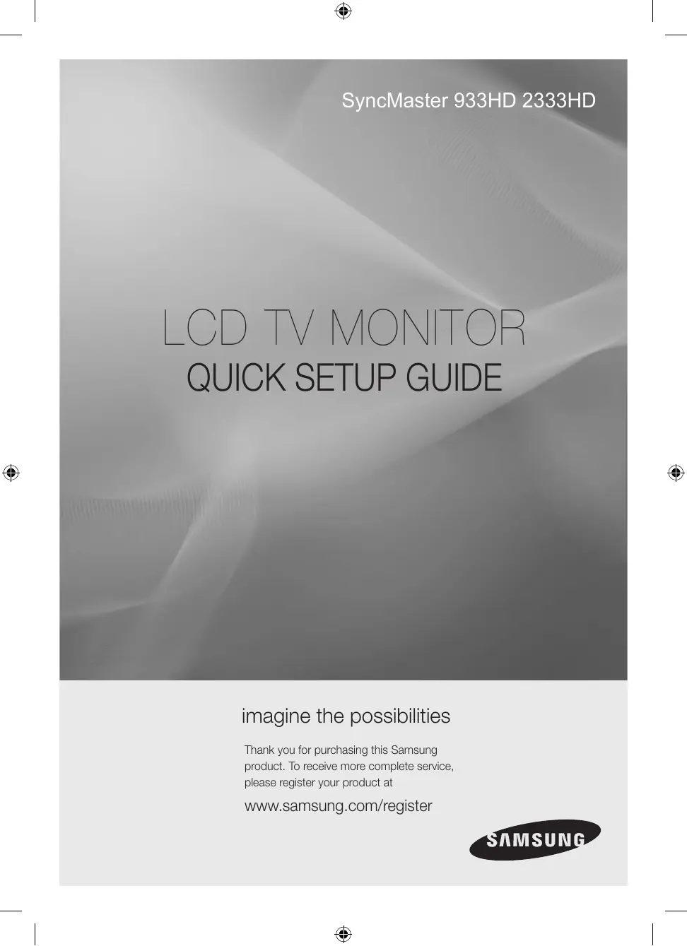 SyncMaster 933HD 2333HD imagine the possibilities Thank you for purchasing this Samsung product. To receive more complete service, please register your product at Www.samsung.com/register