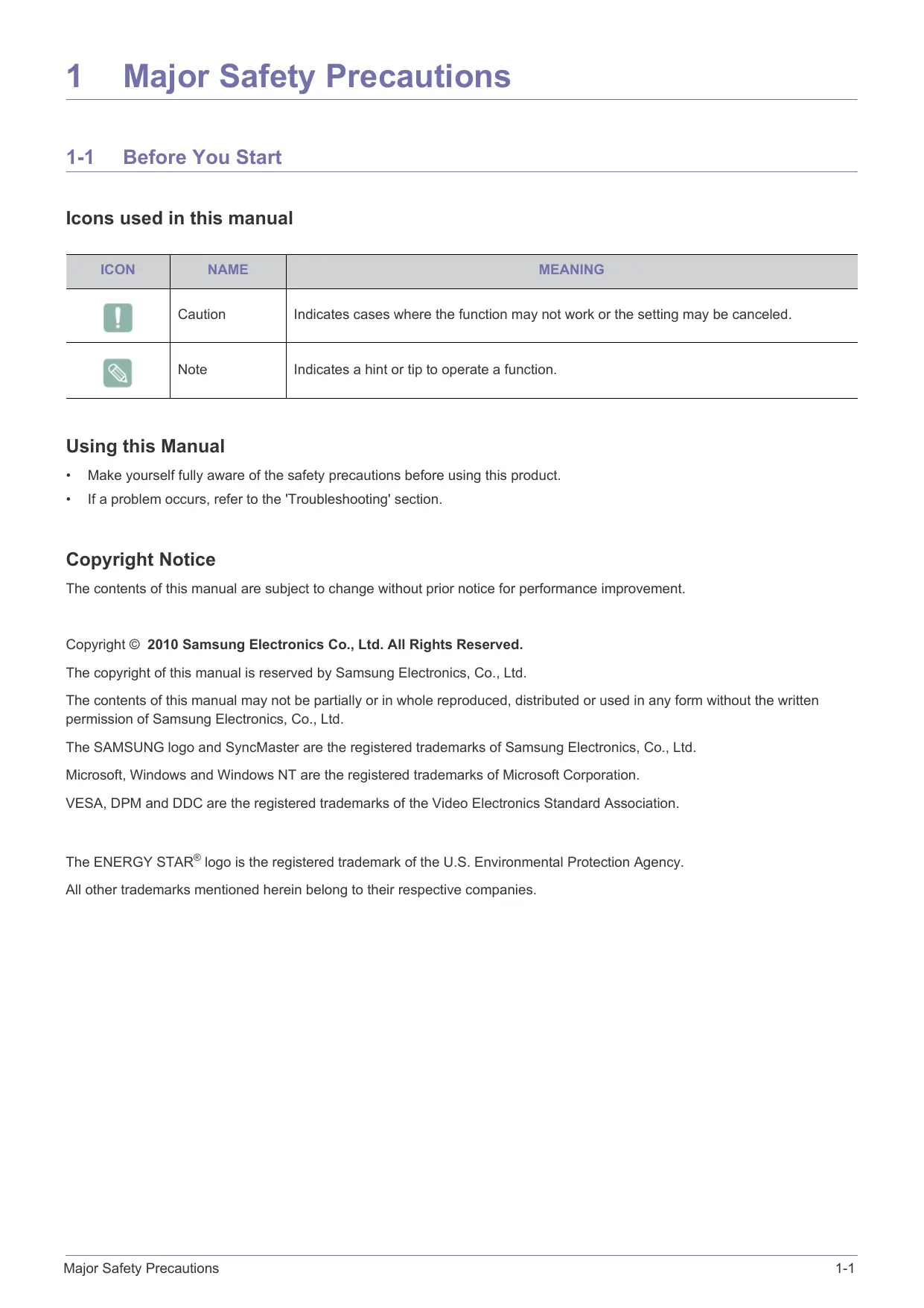 [1] Caution Indicates cases where the function may not work or the setting may be canceled. Note Indicates a hint or tip to operate a function. Using this Manual + Make yourself fully aware of the safety precautions before using this product. +__ fa problem occurs, refer to the Troubleshooting' section. Copyright Notice The contents of this manual are subject to change without prior notice for performance improvement. Copyright © 2010 Samsung Electronics Co., Ltd. All Rights Reserved. The copyright of this manual is reserved by Samsung Electronics, Co., Ltd. The contents of this manual may not be partially or in whole reproduced, distributed or used in any form without the written permission of Samsung Electronics, Co., Ltd. The SAMSUNG logo and SyncMaster are the registered trademarks of Samsung Electronics, Co., Ltd. Microsoft, Windows and Windows NT are the registered trademarks of Microsoft Corporation. VESA, DPM and DDC are the registered trademarks of the Video Electronics Standard Association. The ENERGY STARS logo is the registered trademark of the U.S. Environmental Protection Agency. All other trademarks mentioned herein belong to their respective companies. Major Safety Precautions