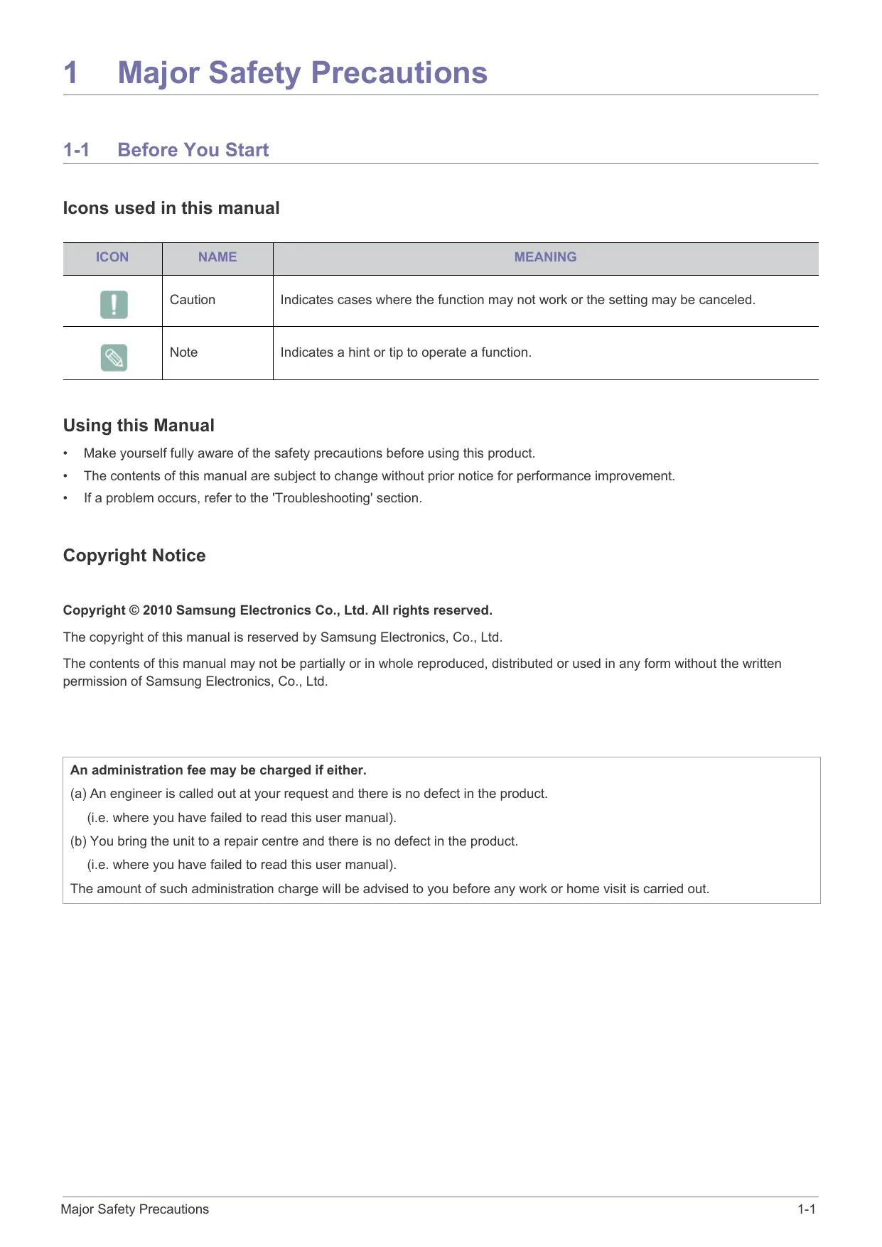 0 Caution Indicates cases where the function may not work or the setting may be canceled. Note Indicates a hint or tip to operate a function. Using this Manual + Make yourself fully aware of the safety precautions before using this product. + The contents of this manual are subject to change without prior notice for performance improvement. +__Ifa problem occurs, refer to the Troubleshooting' section. Copyright Notice Copyright © 2010 Samsung Electronics Co., Ltd. All rights reserved. The copyright of this manual is reserved by Samsung Electronics, Co., Ltd. The contents of this manual may not be partially or in whole reproduced, distributed or used in any form without the written permission of Samsung Electronics, Co., Ltd. An administration fee may be charged if either. (a) An engineer is called out at your request and there is no defect in the product. (i.e. where you have failed to read this user manual). (b) You bring the unit to a repair centre and there is no defect in the product. (i.e. where you have failed to read this user manual). The amount of such administration charge will be advised to you before any work or home visit is carried out. Major Safety Precautions