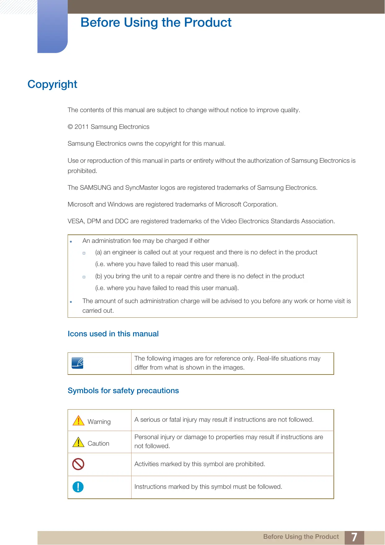 Before Using the Product Copyright The contents of this manual are subject to change without notice to improve quality. © 2011 Samsung Electronics Samsung Electronics owns the copyright for this manual. Use or reproduction of this manual in parts or entirety without the authorization of Samsung Electronics is prohibited. The SAMSUNG and SyncMaster logos are registered trademarks of Samsung Electronics. Microsoft and Windows are registered trademarks of Microsoft Corporation. VESA, DPM and DDC are registered trademarks of the Video Electronics Standards Association...< An administration fee may be charged if either o a) an engineer is called out at your request and there is no defect in the product i.e. where you have failed to read this user manual). (b) you bring the unit to a repair centre and there is no defect in the product i.e. where you have failed to read this user manual). -< The amount of such administration charge will be advised to you before any work or home visit is carried out. Icons used in this manual The following images are for reference only. Real-life situations may differ from what is shown in the images. Symbols for safety precautions À Warning A serious or fatal injury may result if instructions are not followed. Personal injury or damage to properties may result if instructions are À Caution not followed. © Activities marked by this symbol are prohibited. O0 Instructions marked by this symbol must be followed.