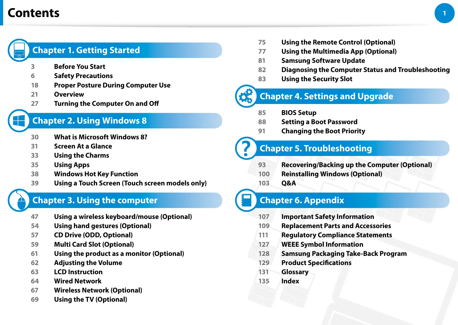 Before You Start Safety Precautions Proper Posture During Computer Use Overview Turning the Computer On and Off O Chapter 2. Using Windows 8 What is Microsoft Windows 8? Screen At a Glance Using the Charms Using Apps Windows Hot Key Function Using a Touch Screen (Touch screen models only) Ô Chapter 3. Using the computer