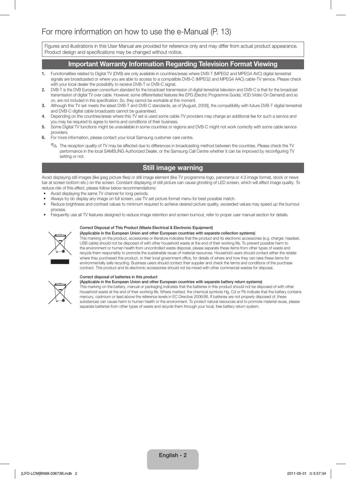 Avoid displaying still images (like jpeg picture files) or still image element (like TV programme logo, panorama or 4:3 image format, stock or news bar at screen bottom etc.) on the screen. Constant displaying of still picture can cause ghosting of LED screen, which will affect image quality. To reduce risk of this effect, please follow below recommendations: • Avoid displaying the same TV channel for long periods. • Always try do display any image on full screen, use TV set picture format menu for best possible match. • Reduce brightness and contrast values to minimum required to achieve desired picture quality, exceeded values may speed up the burnout process. • Frequently use all TV features designed to reduce image retention and screen burnout, refer to proper user manual section for details. Correct Disposal of This Product (Waste Electrical & Electronic Equipment) (Applicable in the European Union and other European countries with separate collection systems) This marking on the product, accessories or literature indicates that the product and its electronic accessories (e.g. charger, headset, USB cable) should not be disposed of with other household waste at the end of their working life. To prevent possible harm to the environment or human health from uncontrolled waste disposal, please separate these items from other types of waste and recycle them responsibly to promote the sustainable reuse of material resources. Household users should contact either the retailer where they purchased this product, or their local government office, for details of where and how they can take these items for environmentally safe recycling. Business users should contact their supplier and check the terms and conditions of the purchase contract. This product and its electronic accessories should not be mixed with other commercial wastes for disposal. Correct disposal of batteries in this product (Applicable in the European Union and other European countries with separate battery return systems) This marking on the battery, manual or packaging indicates that the batteries in this product should not be disposed of with other household waste at the end of their working life. Where marked, the chemical symbols Hg, Cd or Pb indicate that the battery contains mercury, cadmium or lead above the reference levels in EC Directive 2006/66. If batteries are not properly disposed of, these substances can cause harm to human health or the environment. To protect natural resources and to promote material reuse, please separate batteries from other types of waste and recycle them through your local, free battery return system.