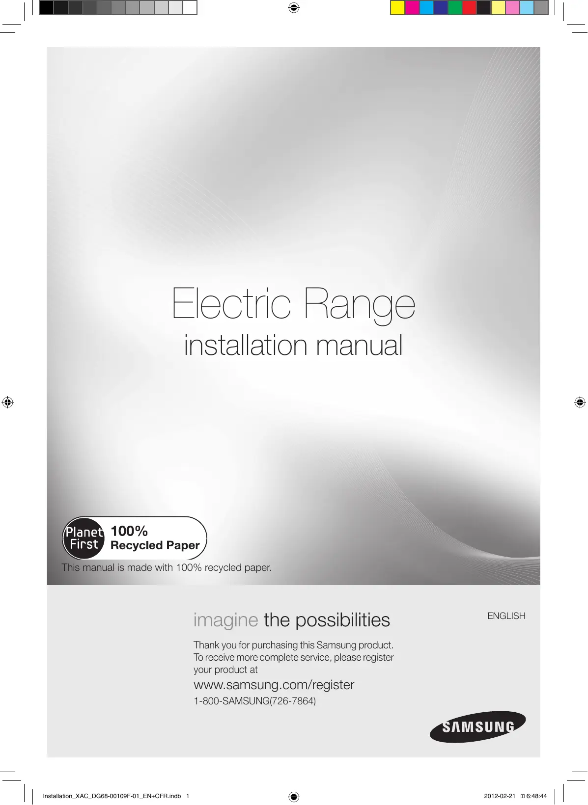<lectric Range installation manual P 100% Recycled Paper is made with 100% recycled paper: ENGLISH imagine the possibilities Thank you for purchasing this Samsung product. To receive more complete service, please register your product at Www.samsung.com/register 1-800-SAMSUNG(726-7864)