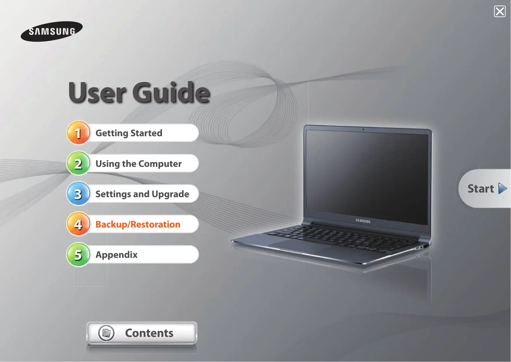 The computer is not turning on or does not respond and displays a blank screen. Restore the computer using Samsung Recovery Solution. 1. Turn the computer on and press the F4 key when the booting screen (SAMSUNG logo) appears. 2. The computer will boot up in restore mode after a short while and Samsung Recovery Solution appears. 3. When the start menu screen appears, click Restore. Pressing Fn + shortcut keys (F1~F12) simultaneously does not work. Press Fn Lock key first, and then press shortcut keys (F1~F12) while Fn Lock ON appears.