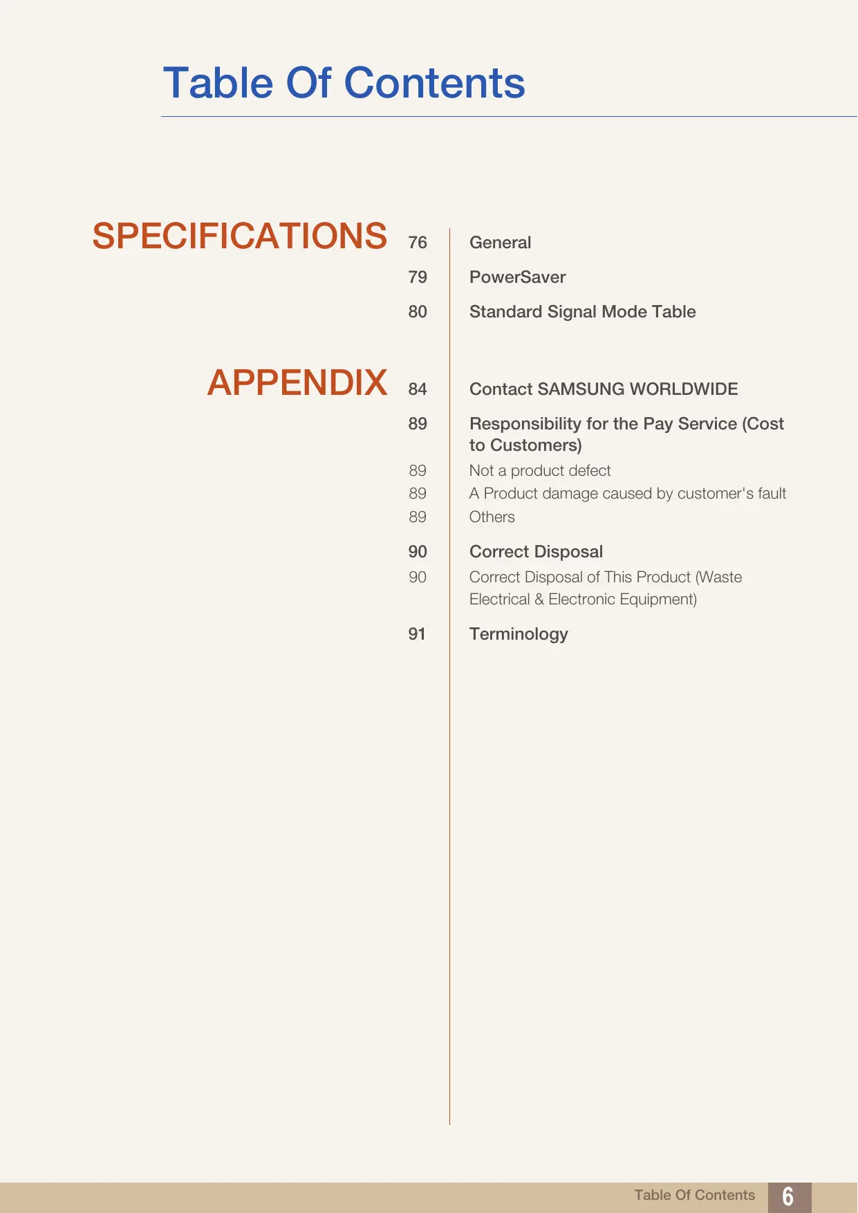 APPENDKX & General PowerSaver Standard Signal Mode Table Contact SAMSUNG WORLDWIDE Responsibility for the Pay Service (Cost to Customers) Not a product defect A Product damage caused by customer's fault Others Correct Disposal Correct Disposal of This Product (Waste Electrical & Electronic Equipment) Terminology