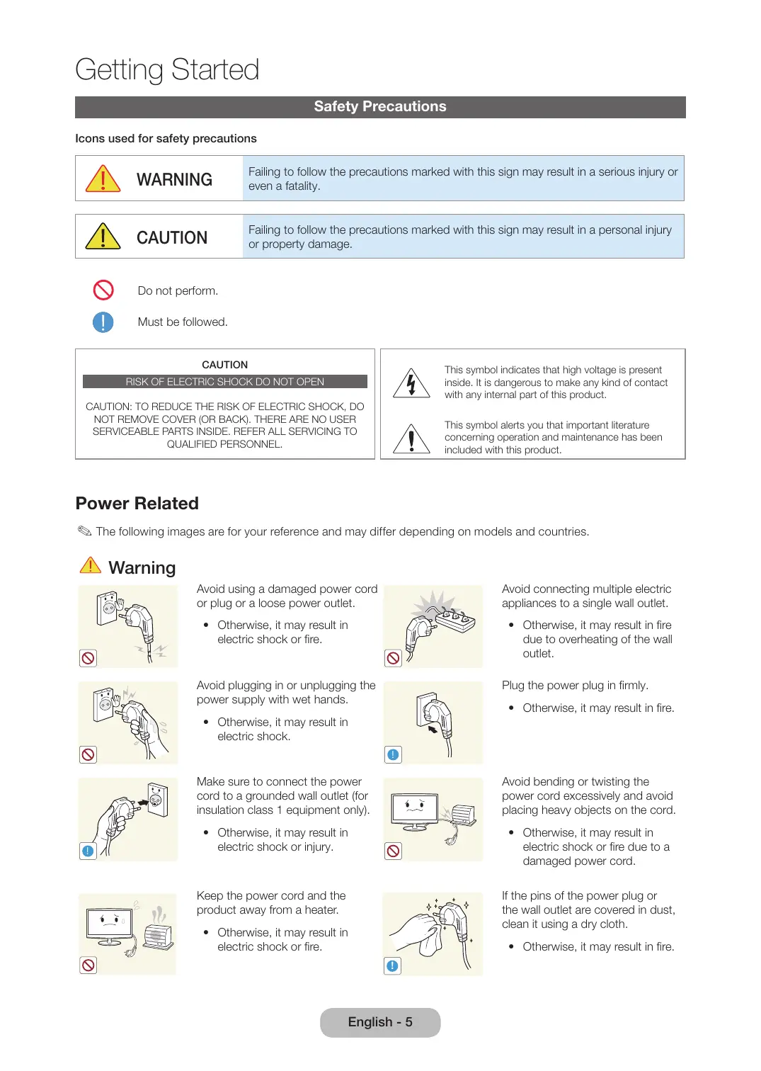 Getting Started À Caution Avoid unplugging the power plug while the product is operating. + Otherwise, it may damage the product due to electric shock. When unplugging the power plug from the wall outlet, make sure to hold it by the plug and not by the cord. + Otherwise, it may result in electric shock or fire. Installation Related Avoid placing burning candles, mosquitorepellentor cigarettes on the product. + Otherwise, it may result in fire. Avoid installing the product in a badly-ventilated location such as inside a bookshelf or closet. + Otherwise, it may result in fire due to internal over-heating. Avoid instaling the product in a location that is unstable or exposed to excessive vibration such as on an unstable or slanted shelf. + _The product may fall and this may result in damage to the product or injury. If you use the product in a location exposed to excessive vibrations, it may result in a problem with the product or fire. English - 6 Make sure to use only the power cord supplied by our company. In addition, do not use the power cord of another electric appliance. + Otherwise, it may result in electric shock or fire. Connect the power plug to a wall outlet that can be easily reached. +_ When a problem occurs with the product, you must unplug the power plug to cut the power off completely. You cannot cut the power off completely using only the power button on the product. Ask an installation engineer or relevant company to instal the product onto the wall. + Otherwise, it may result in injury. + Make sure to use the specified wall mount. Keep the plastic bags used to pack the product away from children! +_Ifchildren place the plastic bags over their heade, they may suffocate. Avoid instaling the product in a location exposed to dust, moisture (sauna), oil, smoke or water (rain drops) and installing it within a vehicle. +_ This may result in electric shock or fire.
