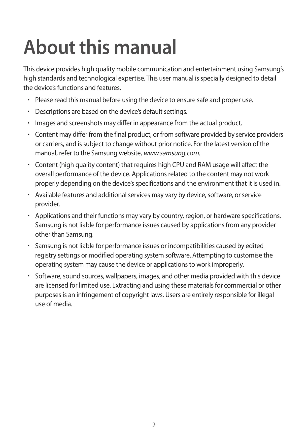 Content may differ from the final product, or from software provided by service providers or carriers, and is subject to change without prior notice. For the latest version of the manual, refer to the Samsung website, www.samsung.com.