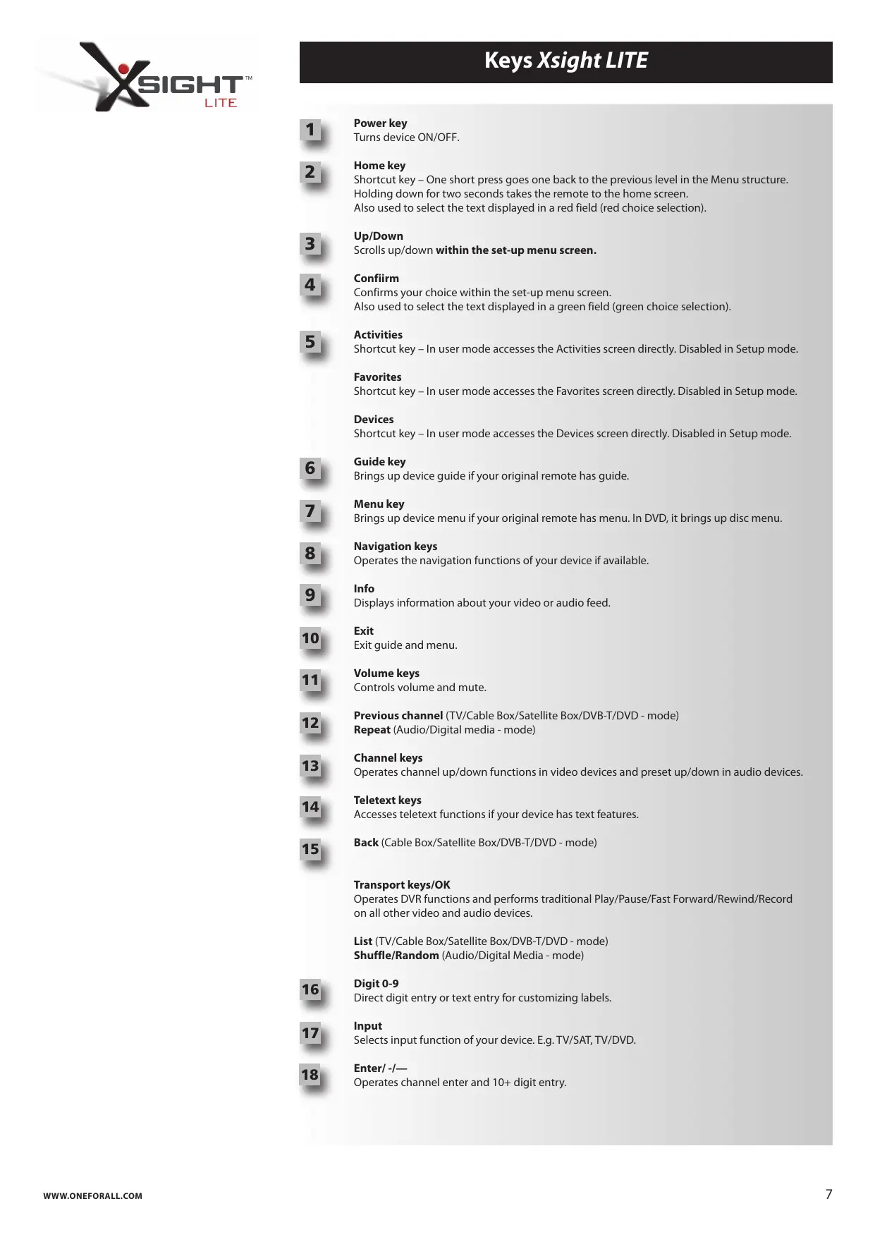The Xsight LITE / Xsight PLUS is the latest fully-featured universal remote control from ONE FOR ALL. It offers full control of all your infra-red controlled Audio Video devices, as well as high-end features such as Learning, and Activity Control. You can set up your remote to control your devices by following the simple on-screen instructions on the remote, or connect to a PC for adding advanced features such as Activities and Favorites.
