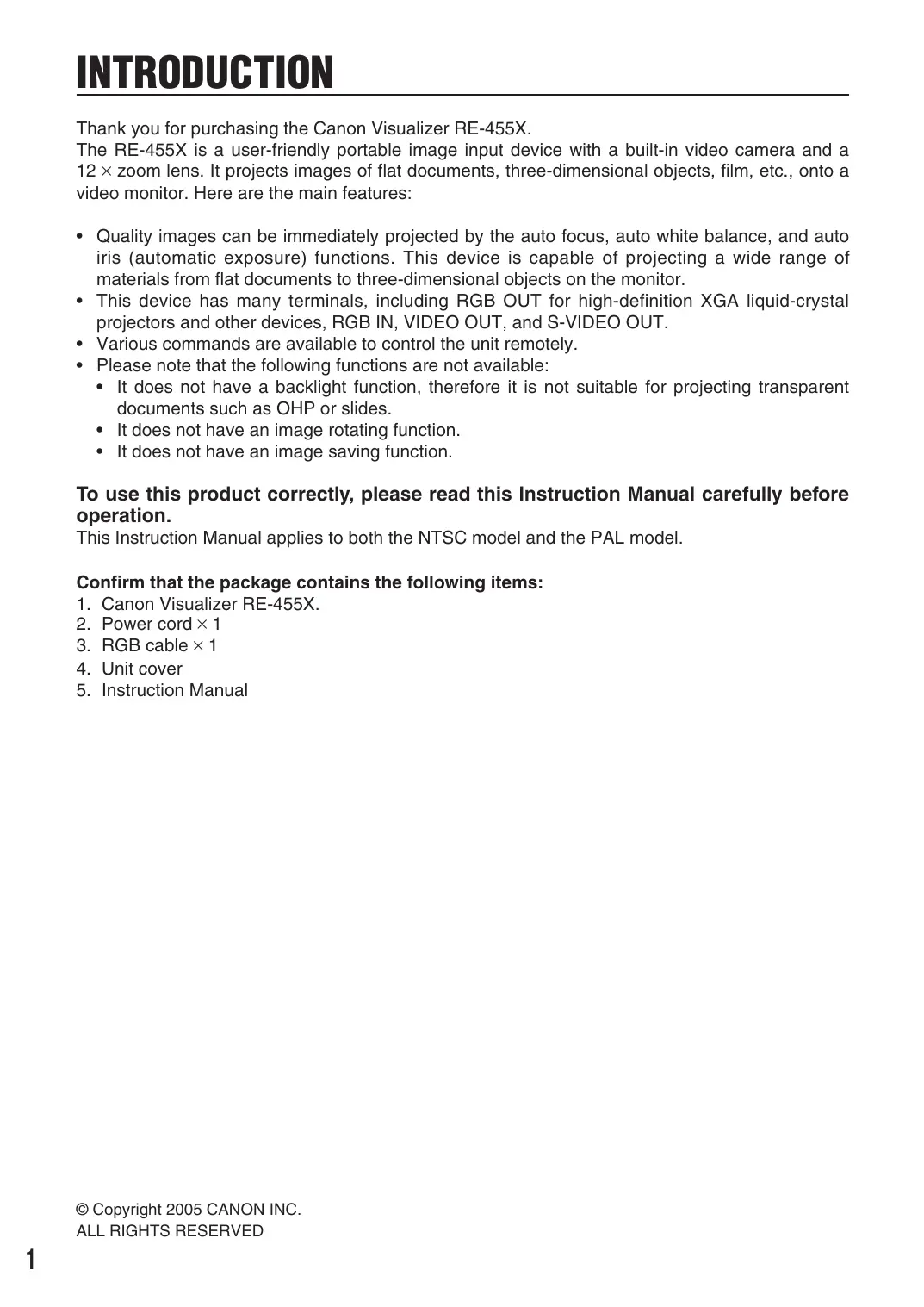 RE-455X INSTRUCTION MANUAL NTSC/PAL INTRODUCTION Thank you for purchasing the Canon Visualizer RE-455X.