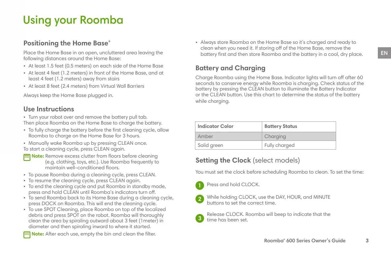 - To use SPOT Cleaning, place Roomba on top of the localized debris and press SPOT on the robot. Roomba will thoroughly clean the area by spiraling outward about 3 feet (1meter) in diameter and then spiraling inward to where it started. Note: After each use, empty the bin and clean the filter. Indicator Color Battery Status Amber Charging Solid green Fully charged Setting the Clock (select models) You must set the clock before scheduling Roomba to clean. To set the time: 1 Press and hold CLOCK. 2 While holding CLOCK, use the DAY, HOUR, and MINUTE buttons to set the correct time. Release CLOCK. Roomba will beep to indicate that the 3 time has been set. Roomba® 600 Series Owner’s Guide