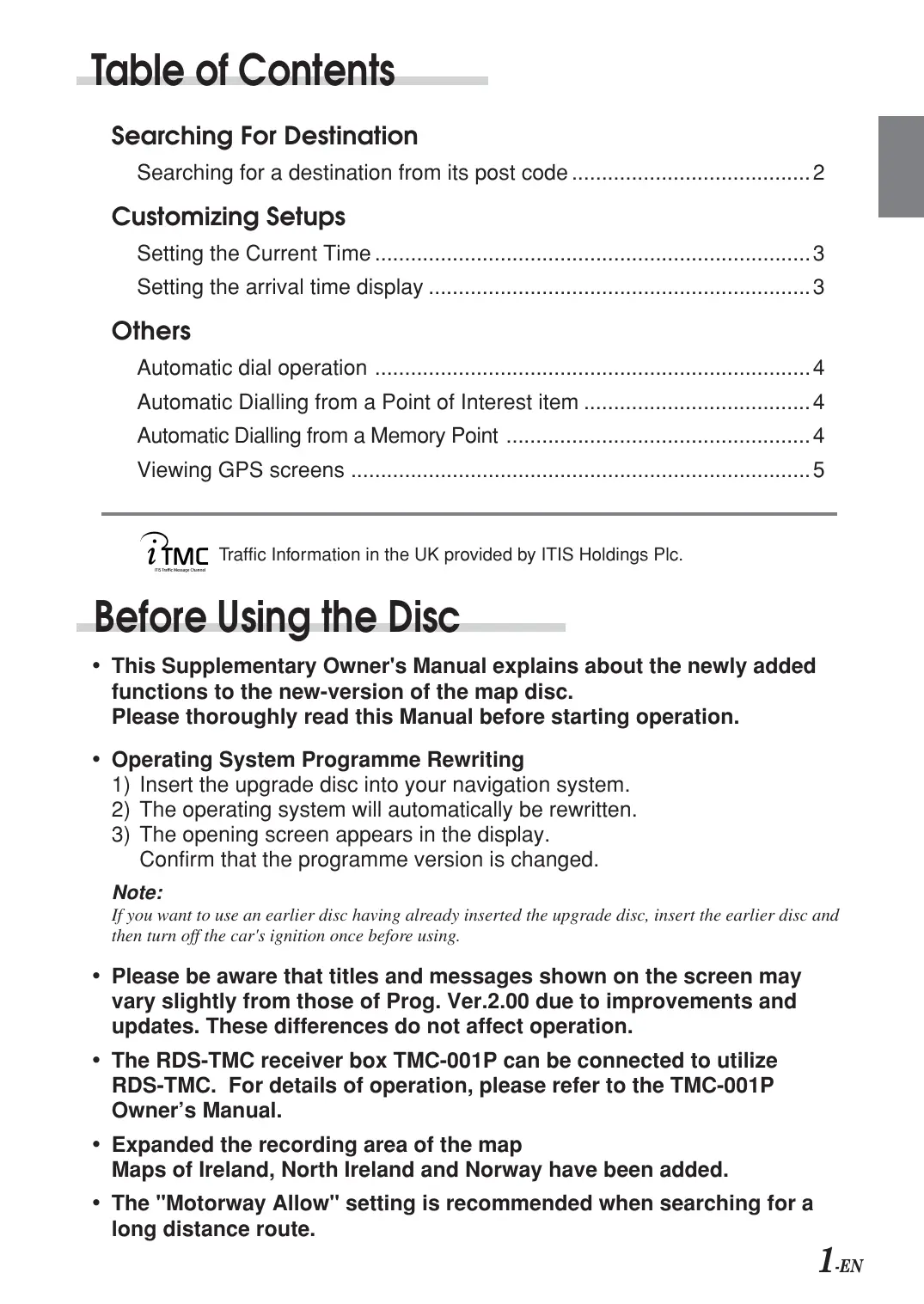 - Automatic Dialling from a Memory Point … Viewing GPS SCreens 5 AT Traffic Information in the UK provided by ITIS Holdings Plc. Before Using the Disc + This Supplementary Owner's Manual explains about the newly added functions to the new-version of the map disc. Please thoroughly read this Manual before starting operation. Operating System Programme Revwriting p. 4