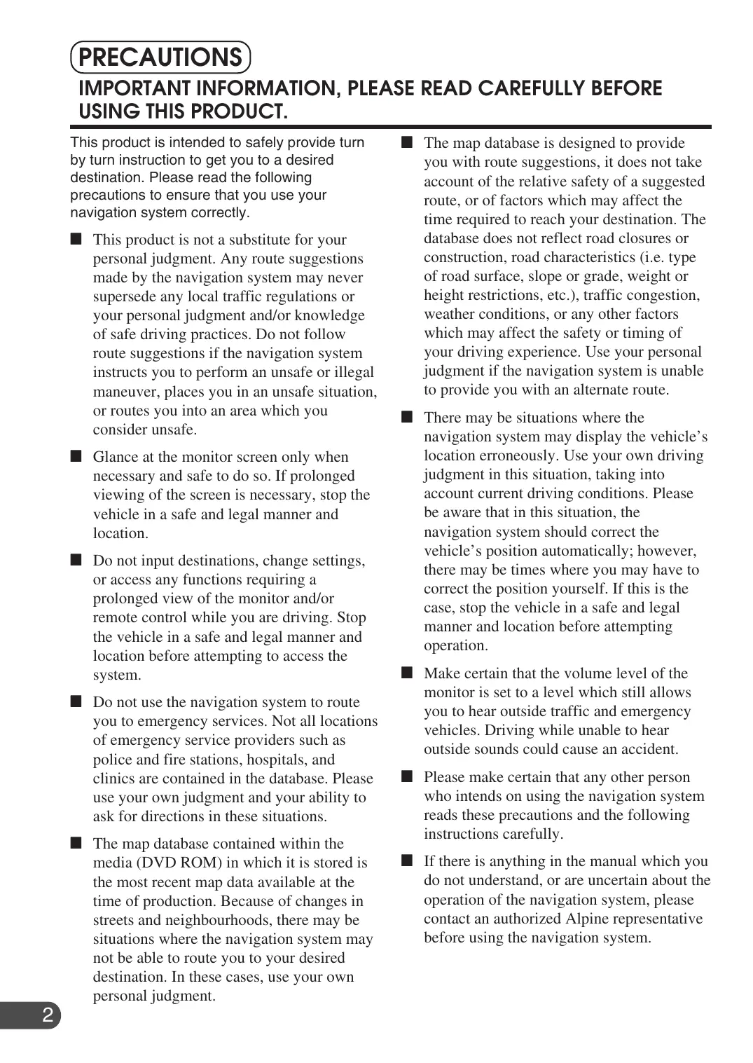 USING THIS PRODUCT. This product is intended to safely provide turn by turn instruction to get you to a desired destination. Please read the following precautions to ensure that you use your navigation system correcily. BH This product is not a substitute for your personal judgment. Any route suggestions made by the navigation system may never supersede any local traffic regulations or your personal judgment and/or knowledge of safe driving practices. Do not follow route suggestions if the navigation system instructs you to perform an unsafe or illegal maneuver, places you in an unsafe situation, or routes you into an area which you consider unsafe. M Glance at the monitor screen only when necessary and safe to do so. If prolonged viewing of the screen is necessary, stop the vehicle in a safe and legal manner and location. BH Do not input destinations, change settings, or access any functions requiring a prolonged view of the monitor and/or remote control while you are driving. Stop the vehicle in a safe and legal manner and location before attempting to access the system. BH Do not use the navigation system to route you to emergency services. Not all locations of emergency service providers such as police and fire stations, hospitals, and clinics are contained in the database. Please use your own judgment and your ability to ask for directions in these situations. M The map database contained within the media (DVD ROM) in which it is stored is the most recent map data available at the time of production. Because of changes in streets and neighbourhoods, there may be situations where the navigation system may not be able to route you to your desired destination. In these cases, use your own personal judgment. M The map database is designed to provide you with route suggestions, it does not take account of the relative safety of a suggested route, or of factors which may affect the time required to reach your destination. The database does not reflect road closures or construction, road characteristics (1.e. type of road surface, slope or grade, weight or height restrictions, etc.), traffic congestion, weather conditions, or any other factors which may affect the safety or timing of your driving experience. Use your personal judgment if the navigation system is unable to provide you with an alternate route. There may be situations where the navigation system may display the vehicle’s location erroneously. Use your own driving judgment in this situation, taking into account current driving conditions. Please be aware that in this situation, the navigation system should correct the vehicle’s position automatically; however, there may be times where you may have to correct the position yourself. If this is the case, stop the vehicle in a safe and legal manner and location before attempting operation. Make certain that the volume level of the monitor is set to a level which still allows you to hear outside traffic and emergency vehicles. Driving while unable to hear outside sounds could cause an accident. Please make certain that any other person who intends on using the navigation system reads these precautions and the following instructions carefully. If there is anything in the manual which you do not understand, or are uncertain about the operation of the navigation system, please contact an authorized Alpine representative before using the navigation system.