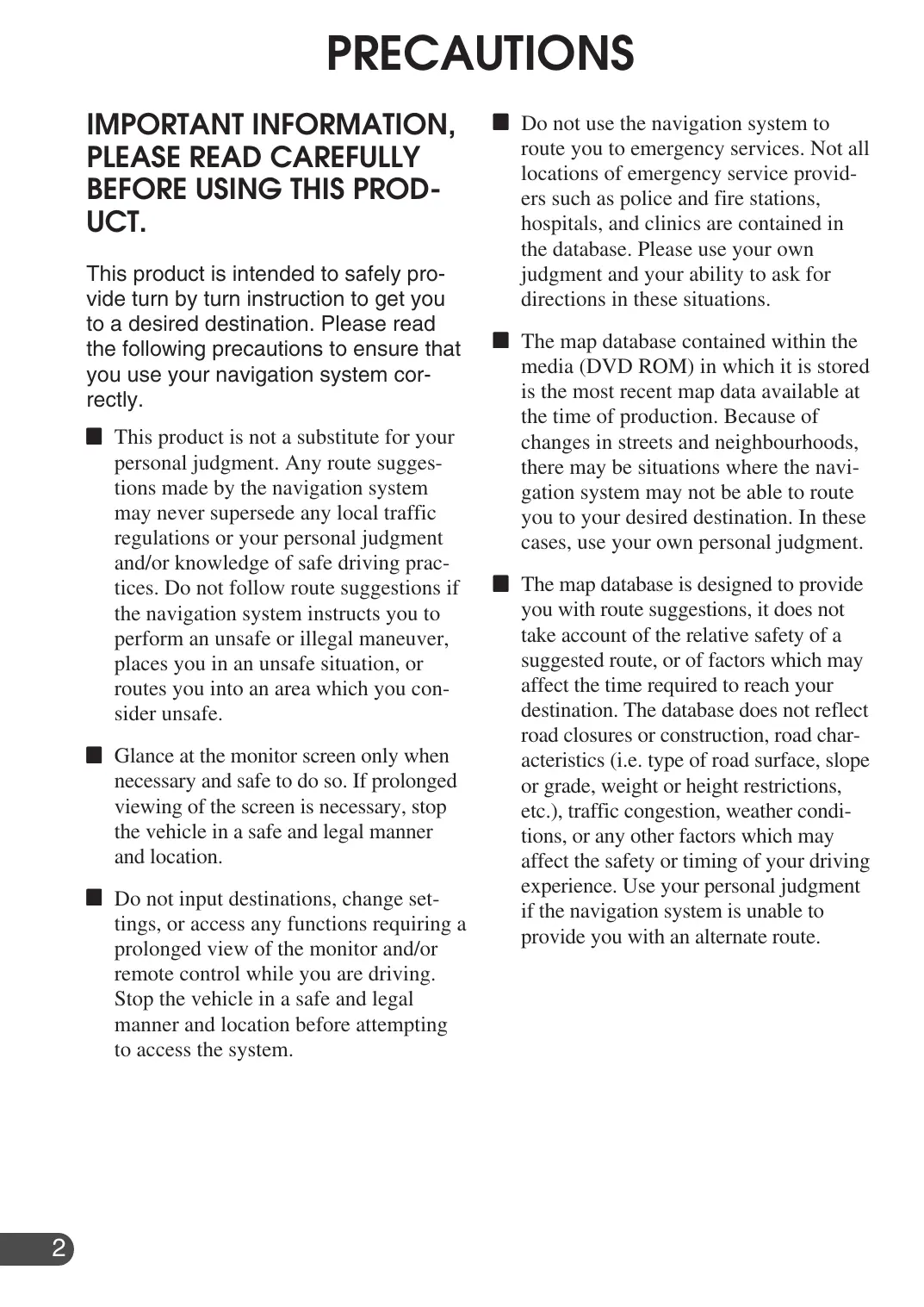 UCT. This product is intended to safely pro- vide turn by turn instruction to get you to a desired destination. Please read the following precautions to ensure that you use your navigation system cor- rectly. B This product is not a substitute for your personal judgment. Any route sugges- tions made by the navigation system may never supersede any local traffic regulations or your personal judgment and/or knowledge of safe driving prac- tices. Do not follow route suggestions if the navigation system instructs you to perform an unsafe or illegal maneuver, places you in an unsafe situation, or routes you into an area which you con- sider unsafe. Æ Glance at the monitor screen only when necessary and safe to do so. If prolonged viewing of the screen is necessary, stop the vehicle in a safe and legal manner and location. B Do not input destinations, change set- tings, or access any functions requiring a prolonged view of the monitor and/or remote control while you are driving. Stop the vehicle in a safe and legal manner and location before attempting to access the system. B Do not use the navigation system to route you to emergency services. Not all locations of emergency service provid- ers such as police and fire stations, hospitals, and clinics are contained in the database. Please use your own judgment and your ability to ask for directions in these situations. B The map database contained within the media (DVD ROM) in which it is stored is the most recent map data available at the time of production. Because of changes in streets and neighbourhoods, there may be situations where the navi- gation system may not be able to route you to your desired destination. In these cases, use your own personal judgment. B The map database is designed to provide you with route suggestions, it does not take account of the relative safety of a suggested route, or of factors which may affect the time required to reach your destination. The database does not reflect road closures or construction, road char- acteristics (1.e. type of road surface, slope or grade, weight or height restrictions, etc.), traffic congestion, weather condi- tions, or any other factors which may affect the safety or timing of your driving experience. Use your personal judgment if the navigation system is unable to provide you with an alternate route.
