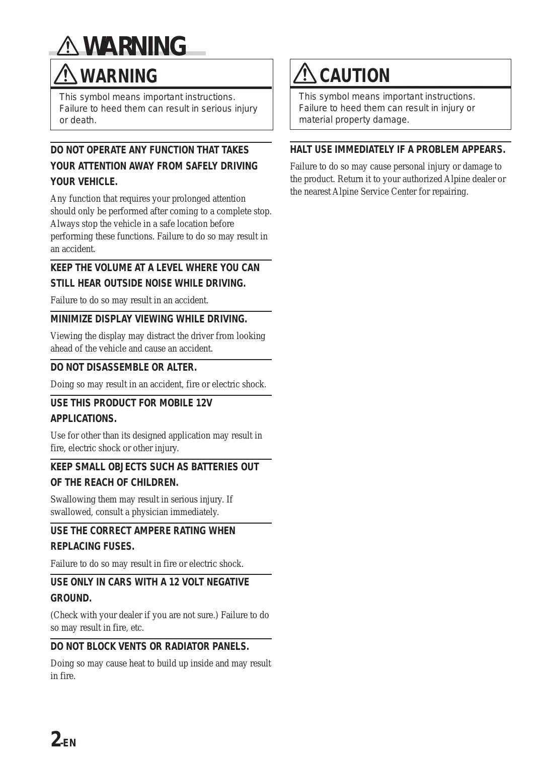 REPLACING FUSES, Failure to do so may result in fire or electric shock. USE ONLY IN CARS WITH A 12 VOLT NEGATIVE GROUND. (Check with your dealer if you are not sure.) Failure to do so may result in fire, etc. DO NOT BLOCK VENTS OR RADIATOR PANELS. Doing so may cause heat to build up inside and may result in fire. 2:N HALT USE IMMEDIATELY IF À PROBLEM APPEARS. Failure to do so may cause personal injury or damage to the product. Retum it to your authorized Alpine dealer or the nearest Alpine Service Center for repairing.