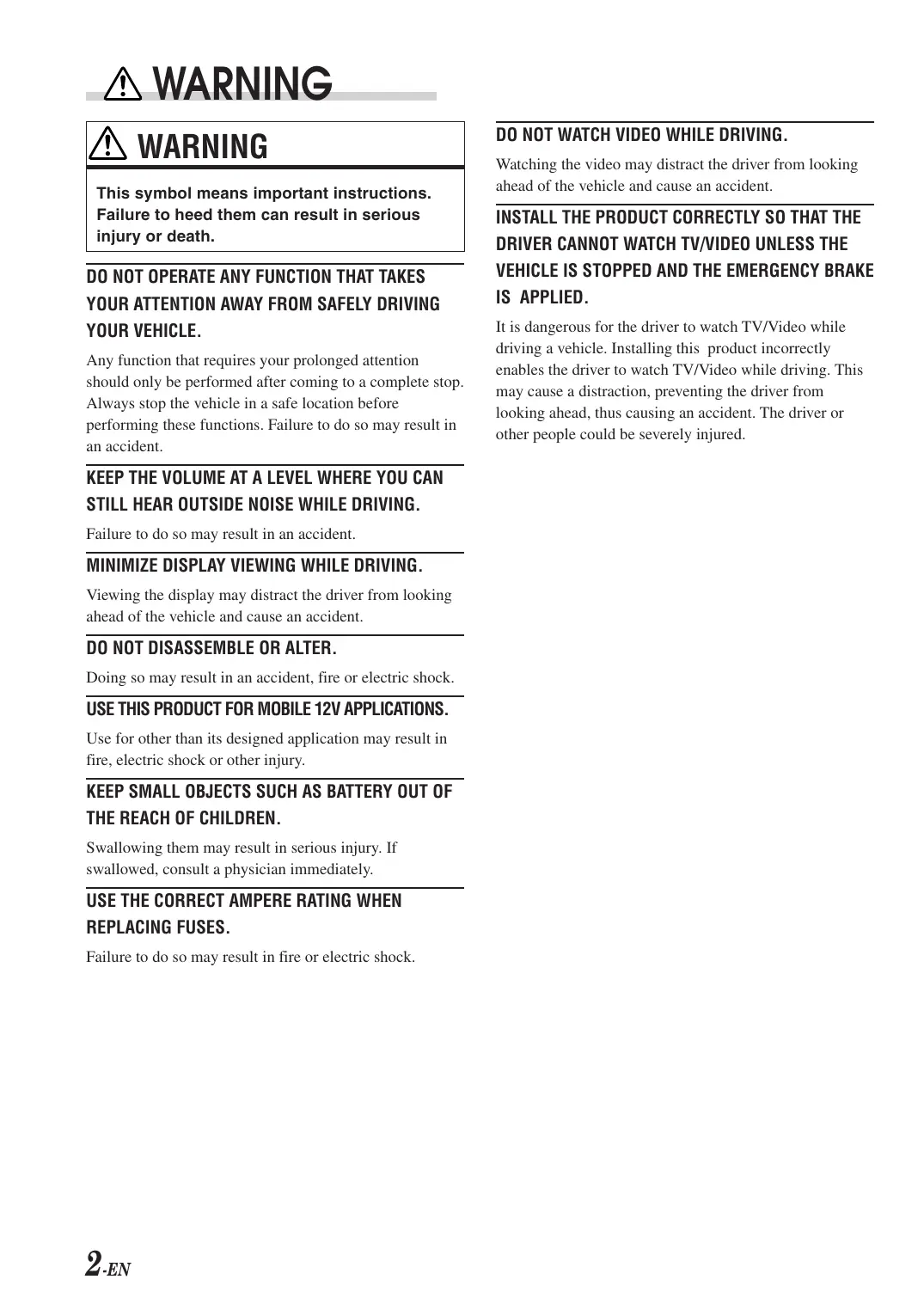 REPLACING FUSES. Failure to do so may result in fire or electric shock. 2 -EN DO NOT WATCH VIDEO WHILE DRIVING. Watching the video may distract the driver from looking ahead of the vehicle and cause an accident. INSTALL THE PRODUCT CORRECTLY SO THAT THE DRIVER CANNOT WATCH TV/VIDEO UNLESS THE VEHICLE 1S STOPPED AND THE EMERGENCY BRAKE IS APPLIED. It is dangerous for the driver to watch TV/Video while driving a vehicle. Installing this product incorrectly enables the driver to watch TV/Video while driving. This may cause a distraction, preventing the driver from looking ahead, thus causing an accident. The driver or other people could be severely injured.