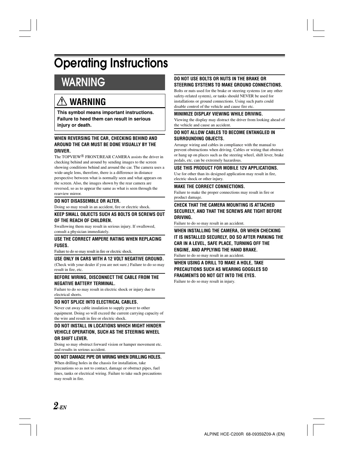 Download the instructions for your Car stereo in PDF format for free! Find your manual HCE-C200 - ALPINE and take your electronic device back in hand. On this page are published all the documents necessary for the use of your device. HCE-C200 by ALPINE.