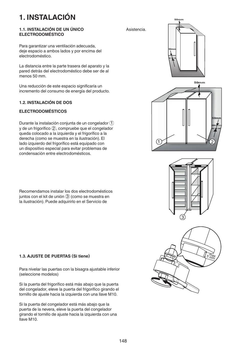Una reducción de este espacio significaría un incremento del consumo de energía del producto. 1.2. INSTALACIÓN DE DOS ELECTRODOMÉSTICOS Durante la instalación conjunta de un congelador 1 y de un frigorífico 2 , compruebe que el congelador queda colocado a la izquierda y el frigorífico a la derecha (como se muestra en la ilustración). El lado izquierdo del frigorífico está equipado con un dispositivo especial para evitar problemas de condensación entre electrodomésticos.