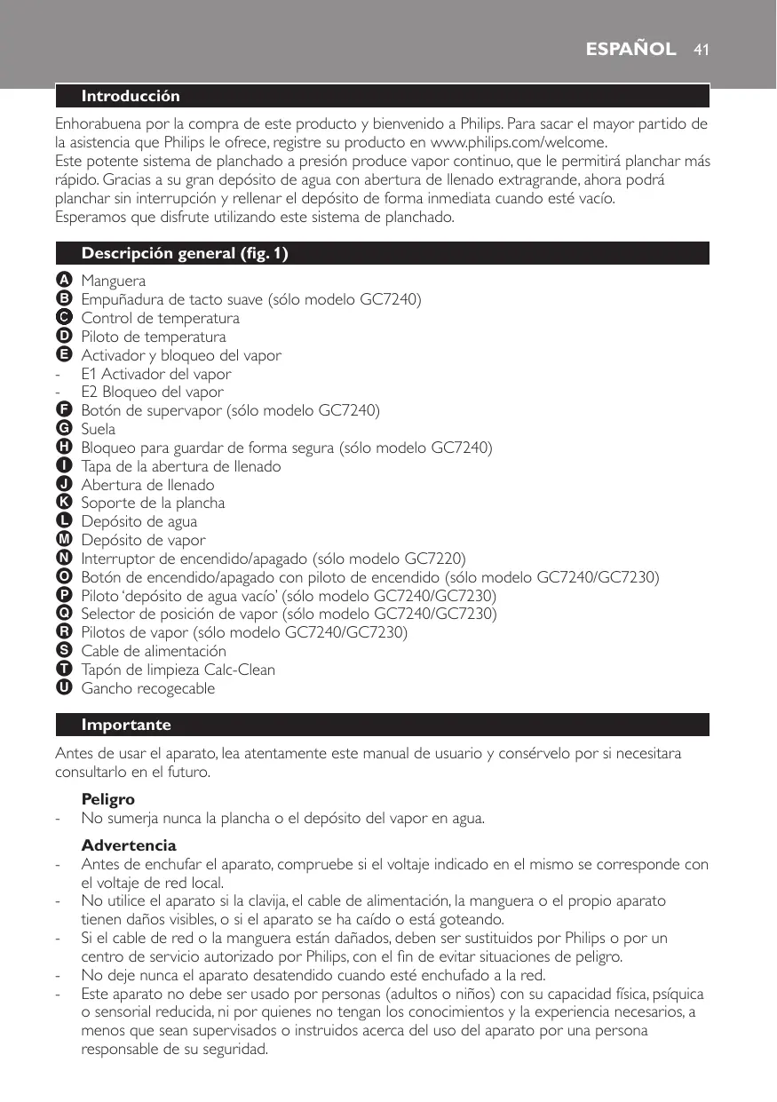 Manguera Empuñadura de tacto suave (sólo modelo GC7240) Control de temperatura Piloto de temperatura Activador y bloqueo del vapor E1 Activador del vapor E2 Bloqueo del vapor Botón de supervapor (sólo modelo GC7240) Suela Bloqueo para guardar de forma segura (sólo modelo GC7240) Tapa de la abertura de llenado Abertura de llenado Soporte de la plancha Depósito de agua Depósito de vapor Interruptor de encendido/apagado (sólo modelo GC7220) Botón de encendido/apagado con piloto de encendido (sólo modelo GC7240/GC7230) Piloto ‘depósito de agua vacío’ (sólo modelo GC7240/GC7230) Selector de posición de vapor (sólo modelo GC7240/GC7230) Pilotos de vapor (sólo modelo GC7240/GC7230) Cable de alimentación Tapón de limpieza Calc-Clean Gancho recogecable Importante Antes de usar el aparato, lea atentamente este manual de usuario y consérvelo por si necesitara consultarlo en el futuro.