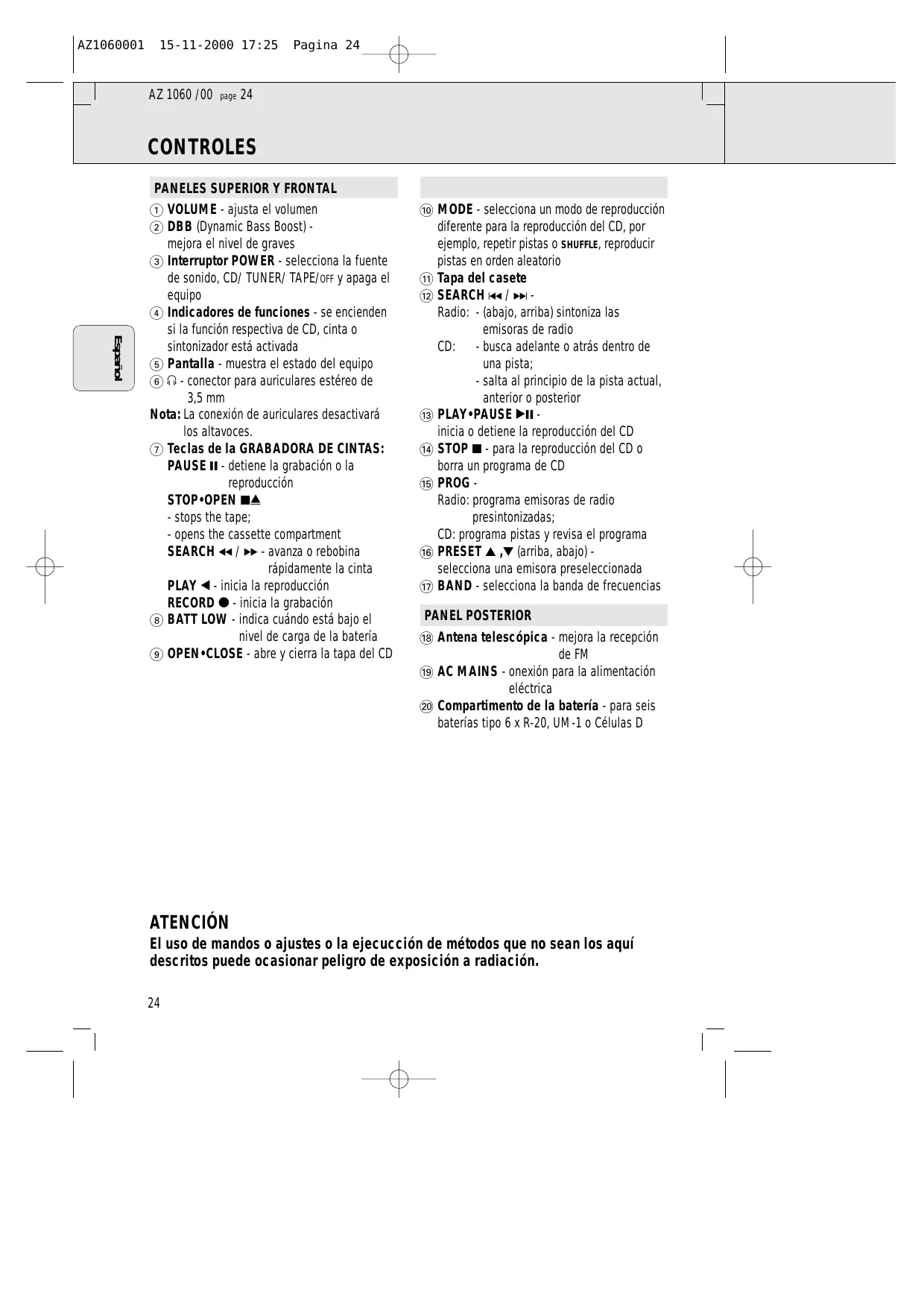 ENTRETIEN TUNE CD TAPE R OFF WER DBB BASS AZ 10 1 VOLUME - ajusta el volumen 2 DBB (Dynamic Bass Boost) mejora el nivel de graves 3 Interruptor POWER - selecciona la fuente de sonido, CD/ TUNER/ TAPE/OFF y apaga el equipo 4 Indicadores de funciones - se encienden si la función respectiva de CD, cinta o sintonizador está activada 5 Pantalla - muestra el estado del equipo 6 p - conector para auriculares estéreo de 3,5 mm Nota: La conexión de auriculares desactivará los altavoces. 7 Teclas de la GRABADORA DE CINTAS: PAUSE ; - detiene la grabación o la reproducción STOP•OPEN 9/ - stops the tape; - opens the cassette compartment SEARCH 5 / 6 - avanza o rebobina rápidamente la cinta PLAY 1 - inicia la reproducción RECORD 0 - inicia la grabación 8 BATT LOW - indica cuándo está bajo el nivel de carga de la batería 9 OPEN•CLOSE - abre y cierra la tapa del CD 0 MODE - selecciona un modo de reproducción diferente para la reproducción del CD, por ejemplo, repetir pistas o SHUFFLE, reproducir pistas en orden aleatorio ! Tapa del casete @ SEARCH ∞ / § Radio: - (abajo, arriba) sintoniza las emisoras de radio CD: - busca adelante o atrás dentro de una pista; - salta al principio de la pista actual, anterior o posterior # PLAY•PAUSE 2; inicia o detiene la reproducción del CD $ STOP 9 - para la reproducción del CD o borra un programa de CD % PROG Radio: programa emisoras de radio presintonizadas; CD: programa pistas y revisa el programa ^ PRESET 3 ,4 (arriba, abajo) selecciona una emisora preseleccionada & BAND - selecciona la banda de frecuencias PANEL POSTERIOR