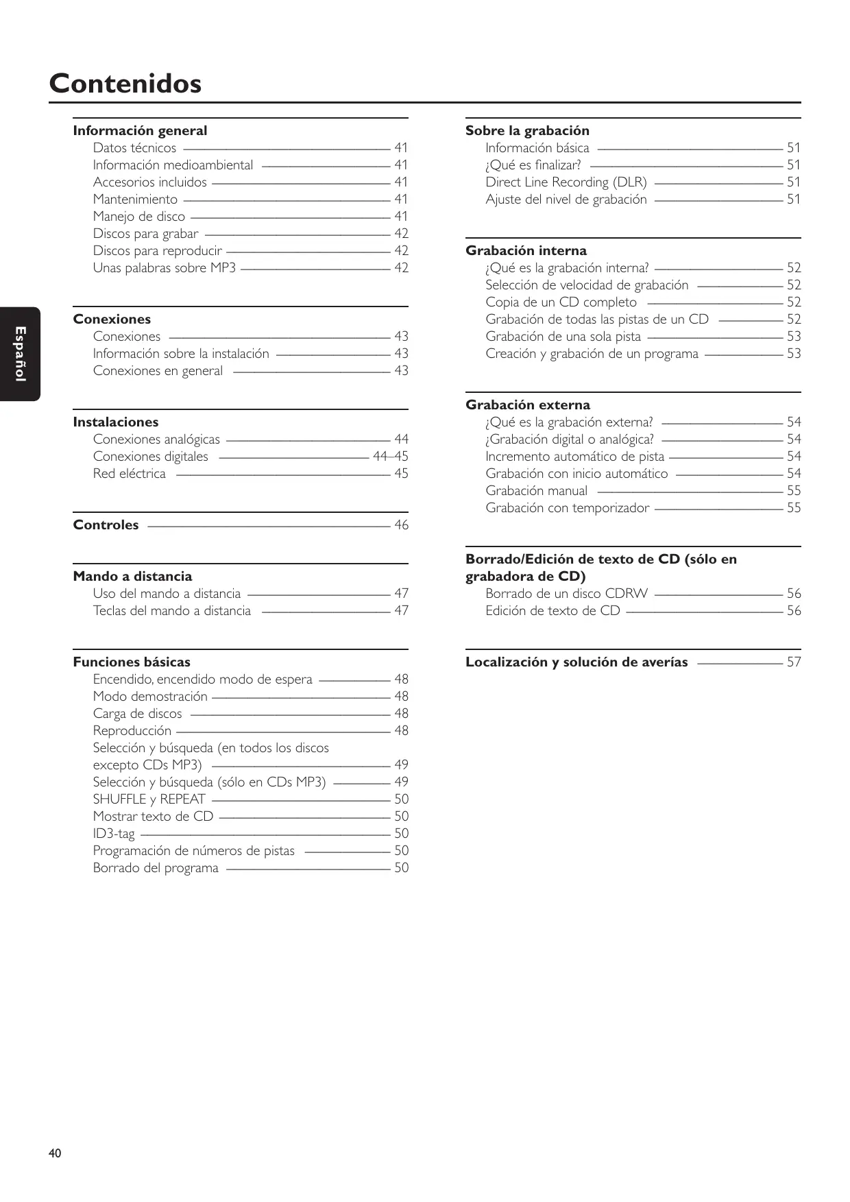 Contenidos Información general Datos técnicos _____________________________ 41 Información medioambiental __________________ 41 Accesorios incluidos _________________________ 41 Mantenimiento _____________________________ 41 Manejo de disco ____________________________ 41 Discos para grabar __________________________ 42 Discos para reproducir _______________________ 42 Unas palabras sobre MP3 _____________________ 42 Español Conexiones Conexiones _______________________________ 43 Información sobre la instalación ________________ 43 Conexiones en general ______________________ 43 Instalaciones Conexiones analógicas _______________________ 44 Conexiones digitales _____________________ 44–45 Red eléctrica ______________________________ 45 Controles __________________________________ 46 Mando a distancia Uso del mando a distancia ____________________ 47 Teclas del mando a distancia __________________ 47 Funciones básicas Encendido, encendido modo de espera __________ 48 Modo demostración _________________________ 48 Carga de discos ____________________________ 48 Reproducción ______________________________ 48 Selección y búsqueda (en todos los discos excepto CDs MP3) _________________________ 49 Selección y búsqueda (sólo en CDs MP3) ________ 49 SHUFFLE y REPEAT _________________________ 50 Mostrar texto de CD ________________________ 50 ID3-tag ___________________________________ 50 Programación de números de pistas ____________ 50 Borrado del programa _______________________ 50
