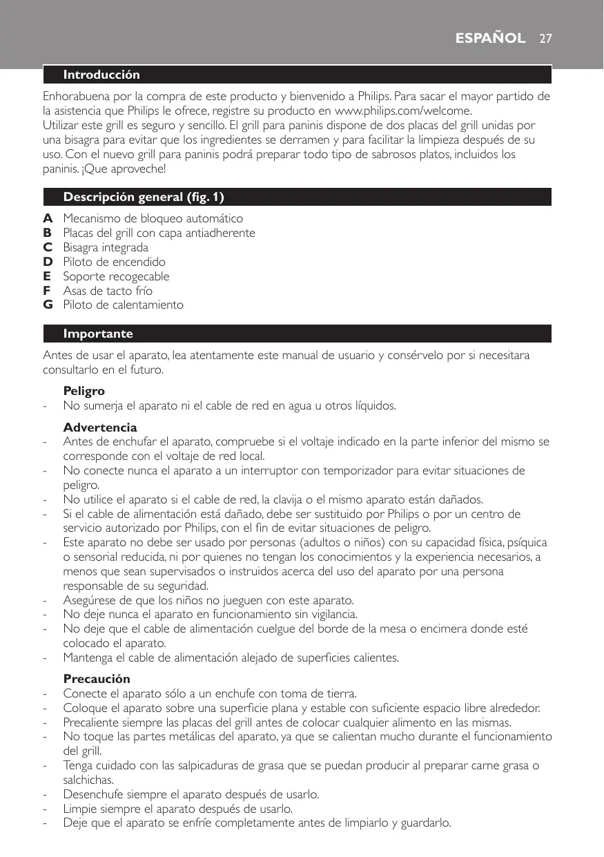 Español 27 Introducción Enhorabuena por la compra de este producto y bienvenido a Philips. Para sacar el mayor partido de la asistencia que Philips le ofrece, registre su producto en www.philips.com/welcome. Utilizar este grill es seguro y sencillo. El grill para paninis dispone de dos placas del grill unidas por una bisagra para evitar que los ingredientes se derramen y para facilitar la limpieza después de su uso. Con el nuevo grill para paninis podrá preparar todo tipo de sabrosos platos, incluidos los paninis. ¡Que aproveche! Descripción general (fig. 1)