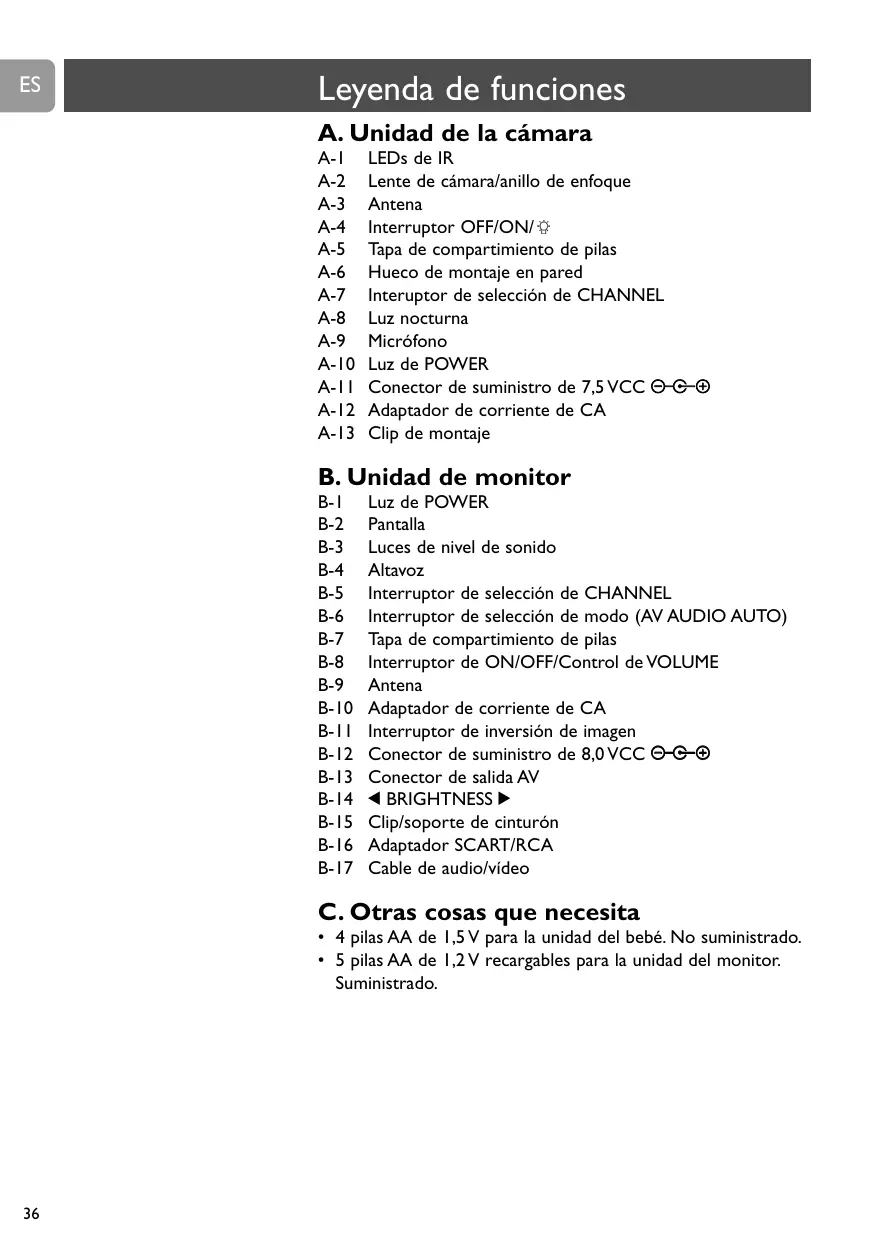 | Alimentación eléctrica | Pilas AA (no incluidas) |
