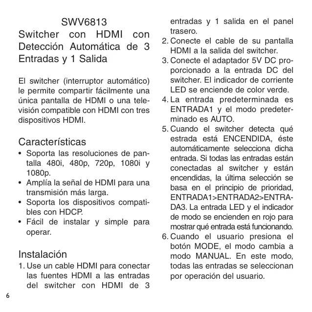 SWV6813 Switcher con HDMI con Detección Automática de 3 Entradas y 1 Salida El switcher (interruptor automático) le permite compartir fácilmente una única pantalla de HDMI o una televisión compatible con HDMI con tres dispositivos HDMI. Características