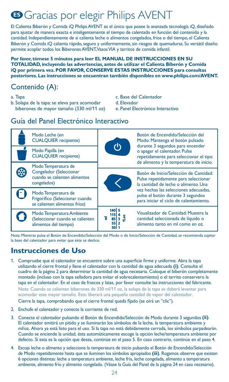 Gracias por elegir Philips AVENT El Calienta Biberón y Comida iQ Philips AVENT es el único que posee la avanzada tecnología iQ, diseñado para ajustar de manera exacta e inteligentemente el tiempo de calentado en función del contenido y la cantidad. Independientemente de si calienta leche o alimentos congelados, fríos o del tiempo, el Calienta Biberón y Comida iQ calienta rápido, seguro y uniformemente, sin riesgos de quemaduras. Su versátil diseño permite acoplar todos los Biberones AVENT,Vasos VIA y tarritos de comida infantil. Por favor, tómese 5 minutos para leer EL MANUAL DE INSTRUCCIONES EN SU TOTALIDAD, incluyendo las advertencias, antes de utilizar el Calienta Biberón y Comida iQ por primera vez. POR FAVOR, CONSERVE ESTAS INSTRUCCIONES para consultas posteriores. Las instrucciones se encuentran también disponibles en www.philips.com/AVENT. Contenido (A): a. Tapa b. Solapa de la tapa: se eleva para acomodar biberones de mayor tamaño (330 ml/11 oz) c. Base del Calentador d. Elevador e. Panel Electrónico Interactivo Guía del Panel Electrónico Interactivo Botón de Encendido/Selección del Modo: Mantenga el botón pulsado durante 3 segundos para encender o apagar el calentador. Pulse repetidamente para seleccionar el tipo de alimento y la temperatura de inicio. Modo Leche (en CUALQUIER recipiente) Modo Papilla (en CUALQUIER recipiente) Modo Temperatura Ambiente (Seleccionar cuando se calienten alimentos del tiempo)