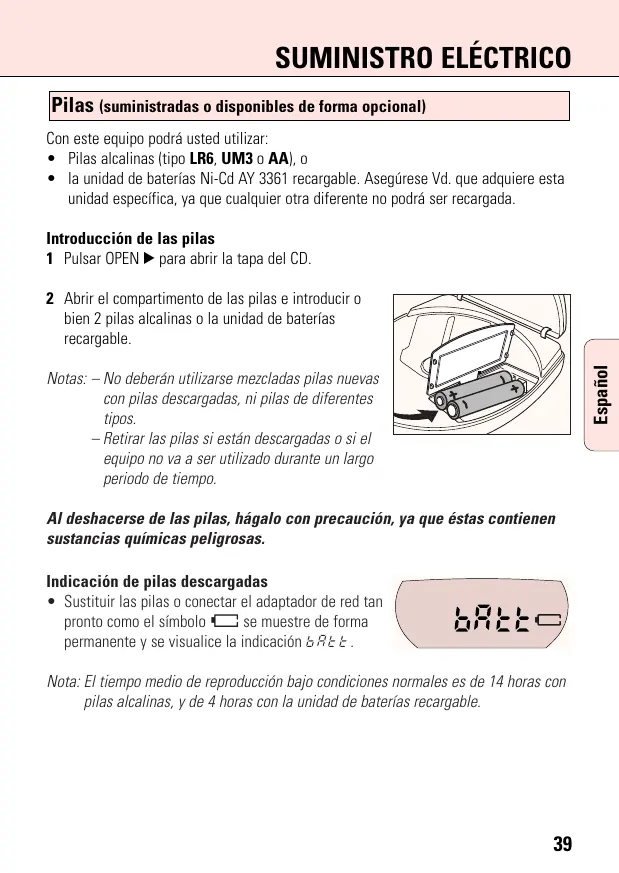 Note: El tiempo medio de reproducción bajo conditiones normales es de 14 horas con pilas alcalinas, y de 4 horas con la unidad de baterías recargable.