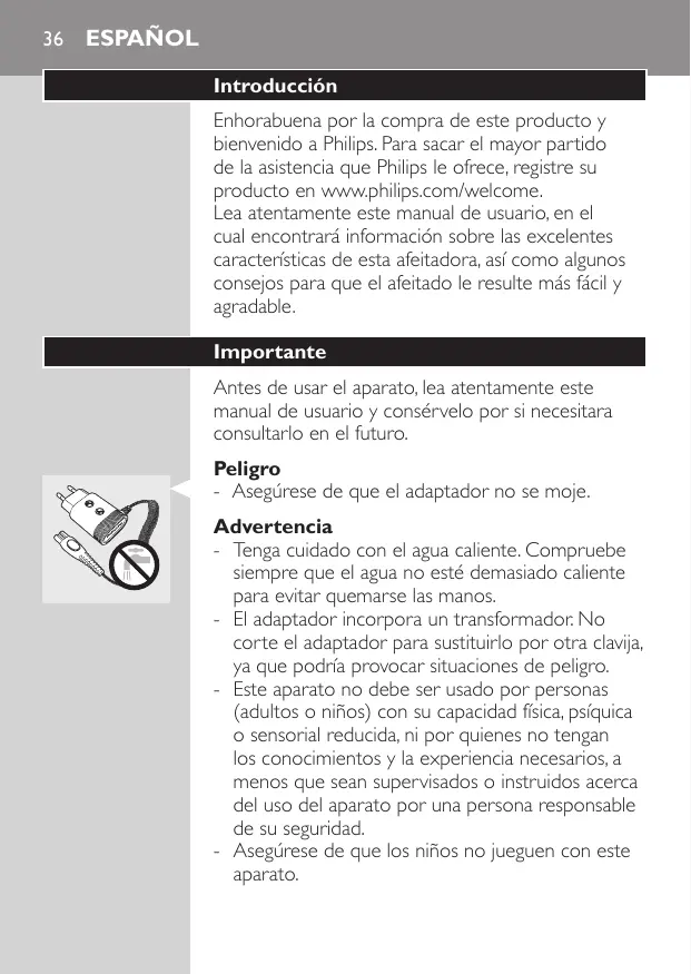 Español Introducción Enhorabuena por la compra de este producto y bienvenido a Philips. Para sacar el mayor partido de la asistencia que Philips le ofrece, registre su producto en www.philips.com/welcome. Lea atentamente este manual de usuario, en el cual encontrará información sobre las excelentes características de esta afeitadora, así como algunos consejos para que el afeitado le resulte más fácil y agradable. Importante Antes de usar el aparato, lea atentamente este manual de usuario y consérvelo por si necesitara consultarlo en el futuro. Peligro - Asegúrese de que el adaptador no se moje. Advertencia - Tenga cuidado con el agua caliente. Compruebe siempre que el agua no esté demasiado caliente para evitar quemarse las manos. - El adaptador incorpora un transformador. No corte el adaptador para sustituirlo por otra clavija, ya que podría provocar situaciones de peligro. - Este aparato no debe ser usado por personas (adultos o niños) con su capacidad física, psíquica o sensorial reducida, ni por quienes no tengan los conocimientos y la experiencia necesarios, a menos que sean supervisados o instruidos acerca del uso del aparato por una persona responsable de su seguridad. - Asegúrese de que los niños no jueguen con este aparato.