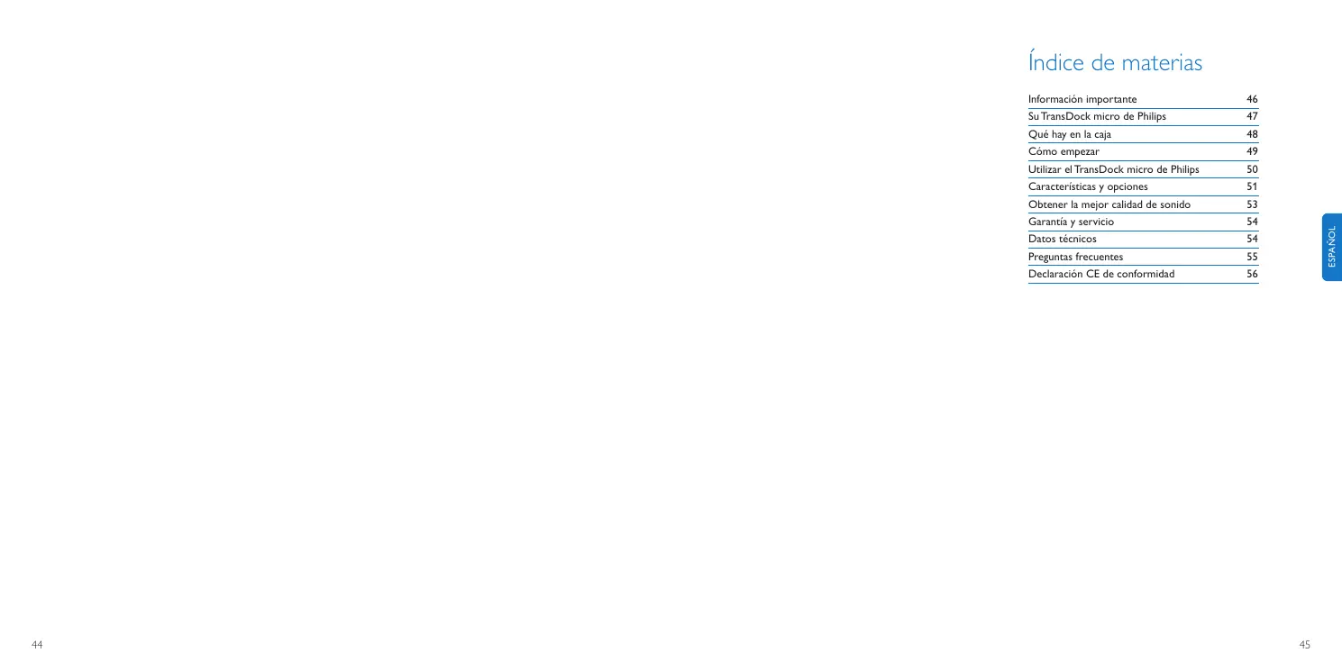 C Importante: Lea con atención las precauciones de seguridad de la página 46 antes de conectar su TransDock micro de Philips. Esta sección le ayudará con la primera instalación de su TransDock micro de Philips.