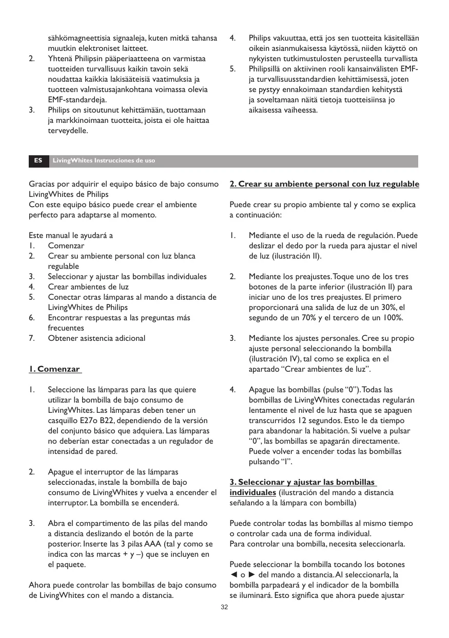 Telecomando Telecomando Selección de luz Encendido / apagado Desligar/ Ligar Off/On Aumento de intensidad/ Disminución deintensidad Botones para crear ambiente LivingWhites Instrucciones de uso Gracias por adquirir el equipo básico de bajo consumo LivingWhites de Philips Con este equipo básico puede crear el ambiente perfecto para adaptarse al momento. Este manual le ayudará a Comenzar Crear su ambiente personal con luz blanca regulable Seleccionar y ajustar las bombillas individuales Crear ambientes de luz Conectar otras lámparas al mando a distancia de LivingWhites de Philips Encontrar respuestas a las preguntas más frecuentes Obtener asistencia adicional