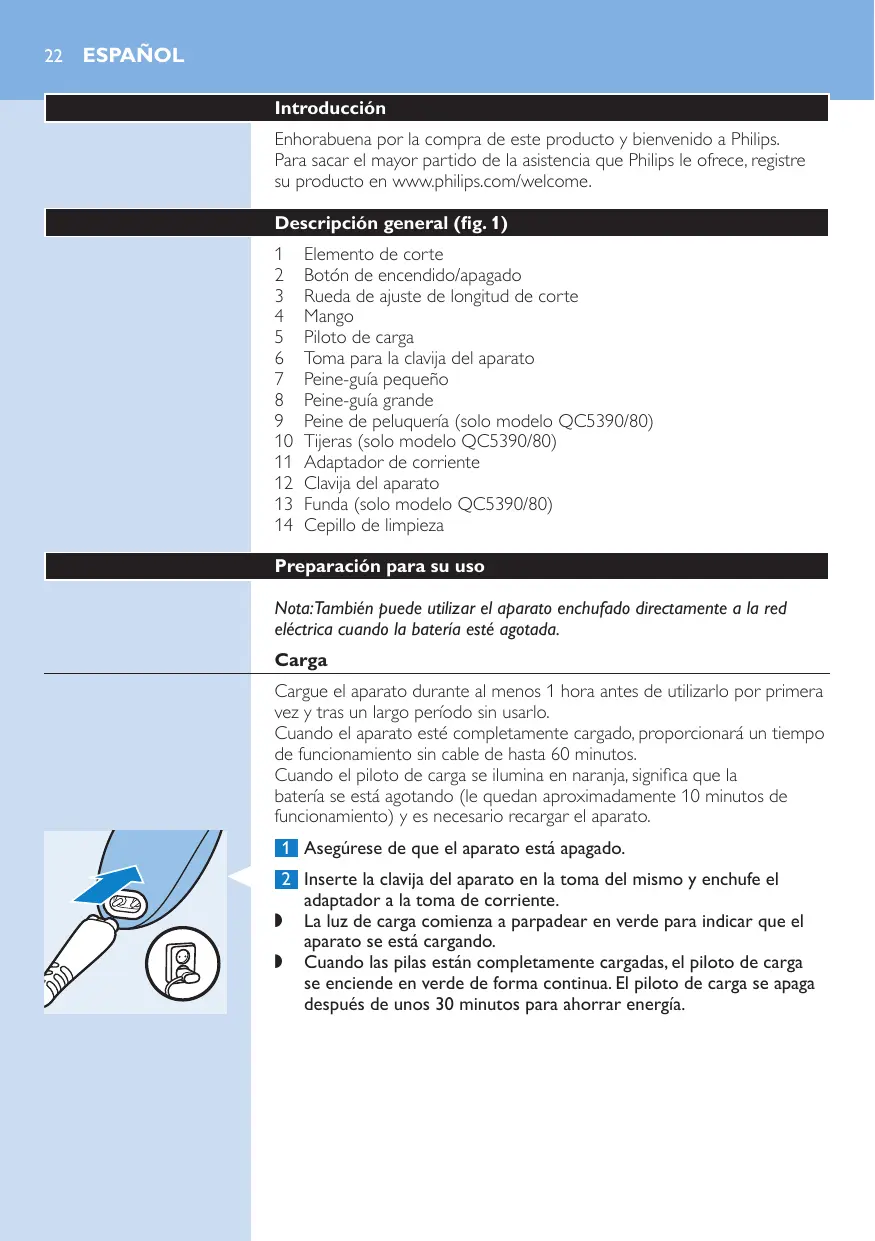 Elemento de corte Botón de encendido/apagado Rueda de ajuste de longitud de corte Mango Piloto de carga Toma para la clavija del aparato Peine-guía pequeño Peine-guía grande Peine de peluquería (solo modelo QC5390/80) Tijeras (solo modelo QC5390/80) Adaptador de corriente Clavija del aparato Funda (solo modelo QC5390/80) Cepillo de limpieza Preparación para su uso Nota:También puede utilizar el aparato enchufado directamente a la red eléctrica cuando la batería esté agotada. Carga Cargue el aparato durante al menos 1 hora antes de utilizarlo por primera vez y tras un largo período sin usarlo. Cuando el aparato esté completamente cargado, proporcionará un tiempo de funcionamiento sin cable de hasta 60 minutos. Cuando el piloto de carga se ilumina en naranja, significa que la batería se está agotando (le quedan aproximadamente 10 minutos de funcionamiento) y es necesario recargar el aparato. 1 Asegúrese de que el aparato está apagado. 2 Inserte la clavija del aparato en la toma del mismo y enchufe el adaptador a la toma de corriente. ,, La luz de carga comienza a parpadear en verde para indicar que el aparato se está cargando. ,, Cuando las pilas están completamente cargadas, el piloto de carga se enciende en verde de forma continua. El piloto de carga se apaga después de unos 30 minutos para ahorrar energía. Español