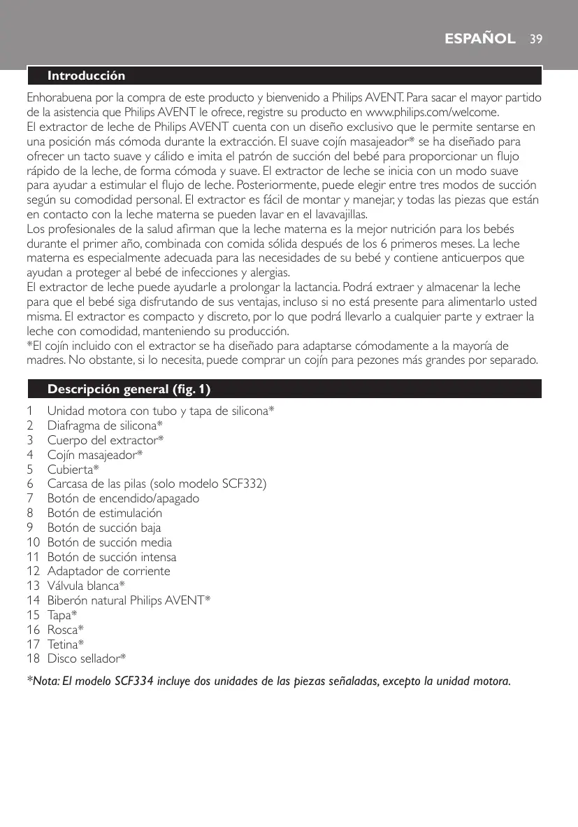 Español 39 Introducción Enhorabuena por la compra de este producto y bienvenido a Philips AVENT. Para sacar el mayor partido de la asistencia que Philips AVENT le ofrece, registre su producto en www.philips.com/welcome. El extractor de leche de Philips AVENT cuenta con un diseño exclusivo que le permite sentarse en una posición más cómoda durante la extracción. El suave cojín masajeador* se ha diseñado para ofrecer un tacto suave y cálido e imita el patrón de succión del bebé para proporcionar un flujo rápido de la leche, de forma cómoda y suave. El extractor de leche se inicia con un modo suave para ayudar a estimular el flujo de leche. Posteriormente, puede elegir entre tres modos de succión según su comodidad personal. El extractor es fácil de montar y manejar, y todas las piezas que están en contacto con la leche materna se pueden lavar en el lavavajillas. Los profesionales de la salud afirman que la leche materna es la mejor nutrición para los bebés durante el primer año, combinada con comida sólida después de los 6 primeros meses. La leche materna es especialmente adecuada para las necesidades de su bebé y contiene anticuerpos que ayudan a proteger al bebé de infecciones y alergias. El extractor de leche puede ayudarle a prolongar la lactancia. Podrá extraer y almacenar la leche para que el bebé siga disfrutando de sus ventajas, incluso si no está presente para alimentarlo usted misma. El extractor es compacto y discreto, por lo que podrá llevarlo a cualquier parte y extraer la leche con comodidad, manteniendo su producción. *El cojín incluido con el extractor se ha diseñado para adaptarse cómodamente a la mayoría de madres. No obstante, si lo necesita, puede comprar un cojín para pezones más grandes por separado. Descripción general (fig. 1)