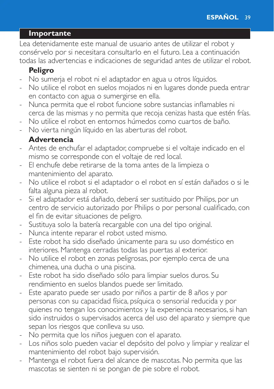 Importante Lea detenidamente este manual de usuario antes de utilizar el robot y consérvelo por si necesitara consultarlo en el futuro. Lea a continuación todas las advertencias e indicaciones de seguridad antes de utilizar el robot. Peligro -- No sumerja el robot ni el adaptador en agua u otros líquidos. -- No utilice el robot en suelos mojados ni en lugares donde pueda entrar en contacto con agua o sumergirse en ella. -- Nunca permita que el robot funcione sobre sustancias inflamables ni cerca de las mismas y no permita que recoja cenizas hasta que estén frías. -- No utilice el robot en entornos húmedos como cuartos de baño. -- No vierta ningún líquido en las aberturas del robot. Advertencia -- Antes de enchufar el adaptador, compruebe si el voltaje indicado en el mismo se corresponde con el voltaje de red local. -- El enchufe debe retirarse de la toma antes de la limpieza o mantenimiento del aparato. -- No utilice el robot si el adaptador o el robot en sí están dañados o si le falta alguna pieza al robot. -- Si el adaptador está dañado, deberá ser sustituido por Philips, por un centro de servicio autorizado por Philips o por personal cualificado, con el fin de evitar situaciones de peligro. -- Sustituya solo la batería recargable con una del tipo original. -- Nunca intente reparar el robot usted mismo. -- Este robot ha sido diseñado únicamente para su uso doméstico en interiores. Mantenga cerradas todas las puertas al exterior. -- No utilice el robot en zonas peligrosas, por ejemplo cerca de una chimenea, una ducha o una piscina. -- Este robot ha sido diseñado sólo para limpiar suelos duros. Su rendimiento en suelos blandos puede ser limitado. -- Este aparato puede ser usado por niños a partir de 8 años y por personas con su capacidad física, psíquica o sensorial reducida y por quienes no tengan los conocimientos y la experiencia necesarios, si han sido instruidos o supervisados acerca del uso del aparato y siempre que sepan los riesgos que conlleva su uso. -- No permita que los niños jueguen con el aparato. -- Los niños solo pueden vaciar el depósito del polvo y limpiar y realizar el mantenimiento del robot bajo supervisión. -- Mantenga el robot fuera del alcance de mascotas. No permita que las mascotas se sienten ni se pongan de pie sobre el robot.
