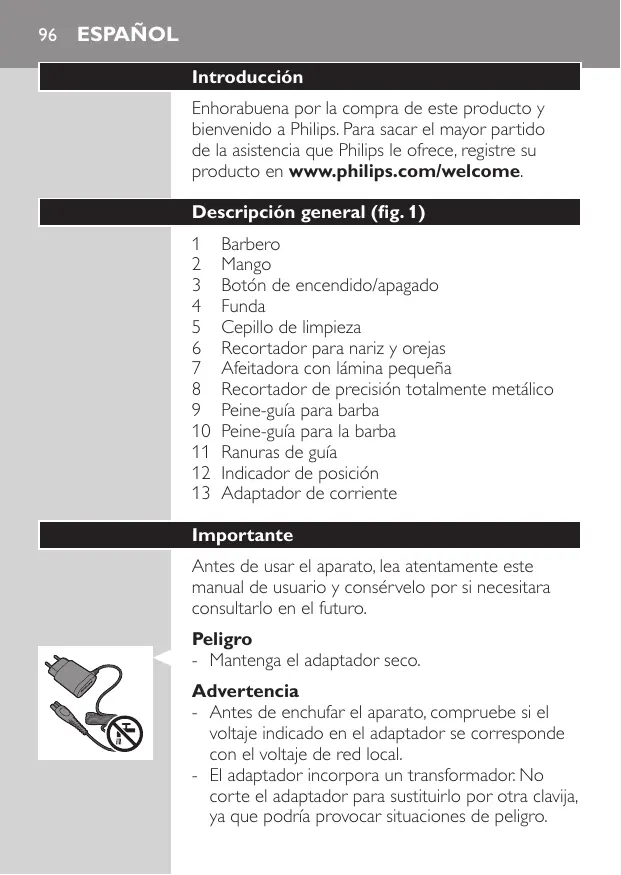 Barbero Mango Botón de encendido/apagado Funda Cepillo de limpieza Recortador para nariz y orejas Afeitadora con lámina pequeña Recortador de precisión totalmente metálico Peine-guía para barba Peine-guía para la barba Ranuras de guía Indicador de posición Adaptador de corriente Importante Antes de usar el aparato, lea atentamente este manual de usuario y consérvelo por si necesitara consultarlo en el futuro. Peligro -- Mantenga el adaptador seco. Advertencia -- Antes de enchufar el aparato, compruebe si el voltaje indicado en el adaptador se corresponde con el voltaje de red local. -- El adaptador incorpora un transformador. No corte el adaptador para sustituirlo por otra clavija, ya que podría provocar situaciones de peligro. Español 97 -- Este aparato no debe ser usado por personas (adultos o niños) con su capacidad física, psíquica o sensorial reducida, ni por quienes no tengan los conocimientos y la experiencia necesarios, a menos que sean supervisados o instruidos acerca del uso del aparato por una persona responsable de su seguridad. -- Este aparato no debe ser usado por niños. Asegúrese de que los niños no jueguen con él. -- Compruebe siempre el aparato antes de utilizarlo. No utilice el aparato si está dañado, ya que podría ocasionar lesiones. -- No utilice el aparato en la bañera o en la ducha. Precaución -- Utilice únicamente el adaptador que se suministra. -- Utilice, cargue y guarde el aparato a una temperatura entre 5 °C y 35 °C. -- Antes de empezar a limpiarlo bajo el grifo, asegúrese de que el aparato está apagado y desenchufado de la red. -- Si el adaptador está dañado, sustitúyalo siempre por otro del modelo original para evitar situaciones de peligro. -- Si el aparato sufre un cambio brusco de temperatura, presión o humedad, deje que se aclimate durante 30 minutos antes de utilizarlo. -- No utilice el aparato si alguna de sus piezas está dañada o rota, ya que podría ocasionar lesiones. -- No utilice nunca aire comprimido, estropajos, agentes abrasivos ni líquidos agresivos, como gasolina o acetona, para limpiar el aparato. -- Nivel de ruido máximo: Lc = 75 dB(A)