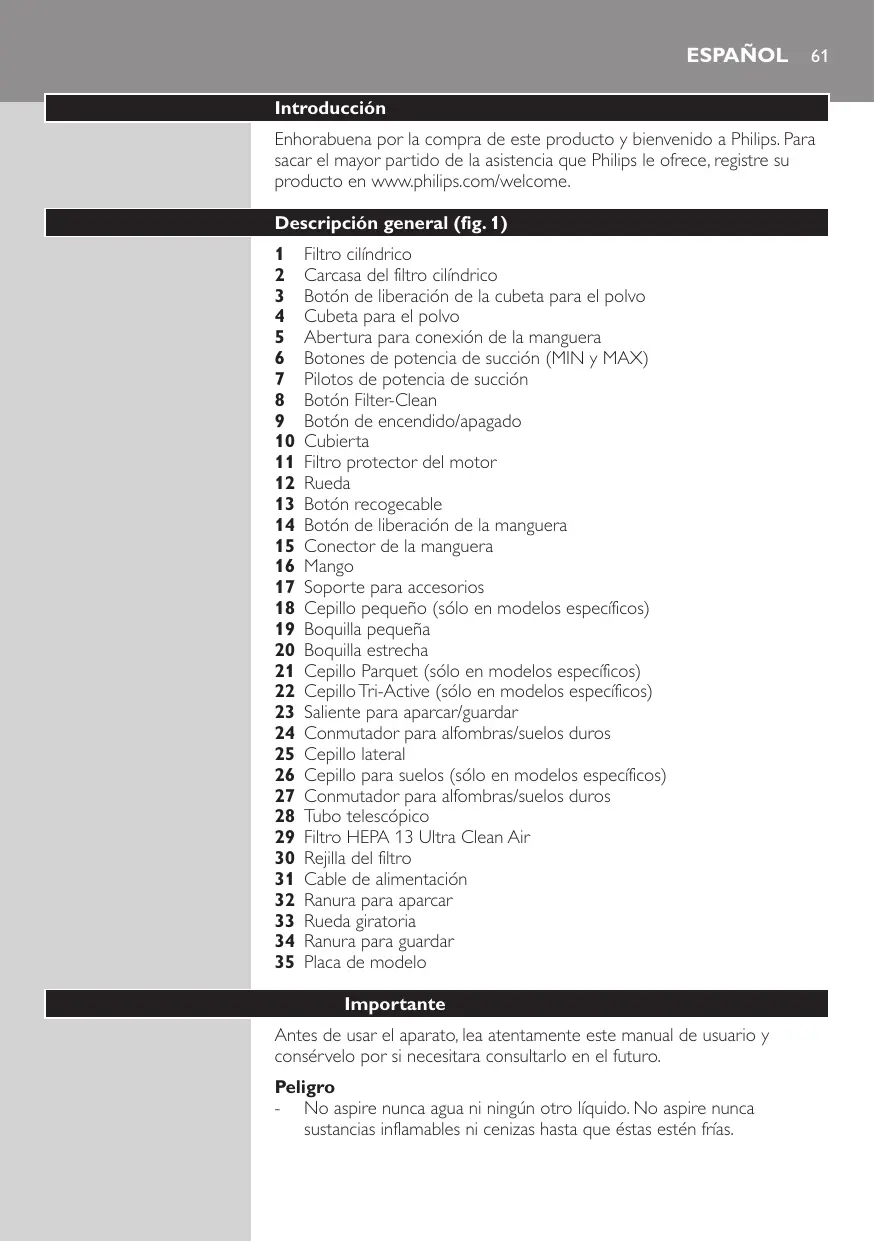 Introducción Enhorabuena por la compra de este producto y bienvenido a Philips. Para sacar el mayor partido de la asistencia que Philips le ofrece, registre su producto en www.philips.com/welcome. Descripción general (fig. 1) 1 2 3 4 5 6 7 8 9 10 11 12 13 14 15 16 17 18 19 20 21 22 23 24 25 26 27 28 29 30 31 32 33 34 35